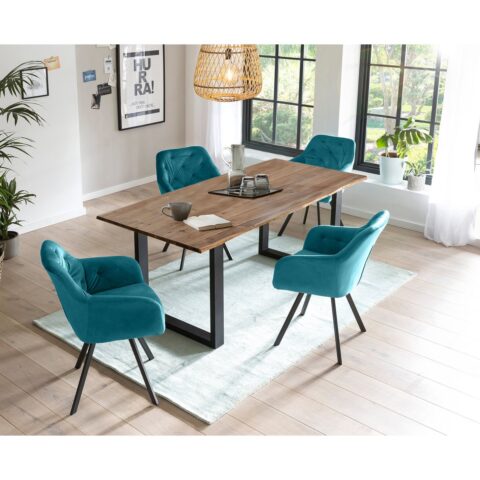 Het moderne X-vormige metalen frame vormt een krachtig contrast met het naturel houten blad en versterkt de industriële uitstraling van het ontwerp. Hierdoor ontstaat een mooie balans tussen warmte, comfort en een stoer karakter. Deze eettafel is ideaal als centrale plek voor dagelijkse maaltijden, gezellige diners en lange avonden met familie of vrienden. Omdat het tafelblad een natuurproduct is, kunnen knoestgaatjes en kleurafwijkingen voorkomen. Dit zijn natuurlijke kenmerken die de authenticiteit van het hout benadrukken.