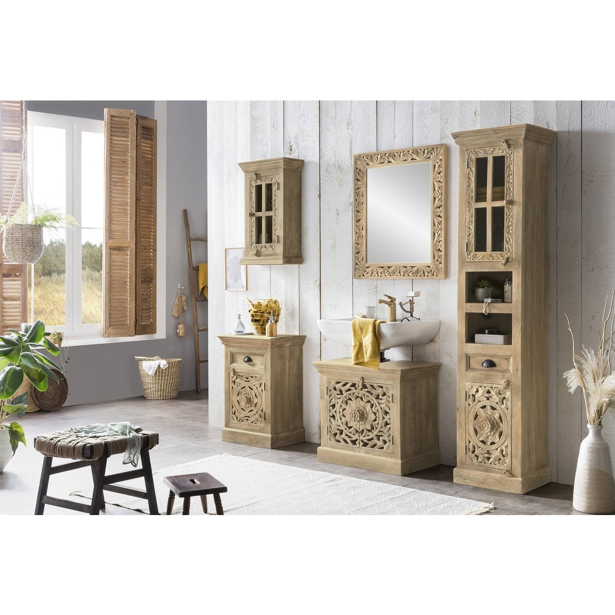 Breng warmte en karakter in de badkamer met deze 5-delige badkamerset van mangohout. De set bestaat uit een hoge kast, een kleine ladekast, een wandkast, een onderkast voor de wastafel en een spiegel met verfijnd houtsnijwerk in het frame. De natuurlijke houtkleur en de decoratieve details geven het geheel een exotische en sfeervolle uitstraling, waardoor de badkamer direct een unieke en stijlvolle look krijgt.