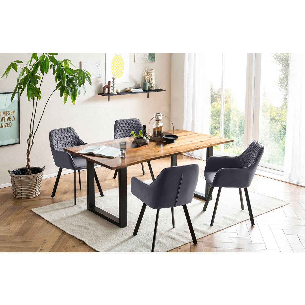 Deze 5-delige eetgroep brengt een stijlvolle mix van massief hout, metaal en zachte velvet bekleding in de eetkamer. De eettafel is gemaakt van massief acaciahout en uitgevoerd in een warme natuurtint. Het zwarte metalen U-frame zorgt voor een strak contrast en geeft de tafel een moderne en stabiele basis.