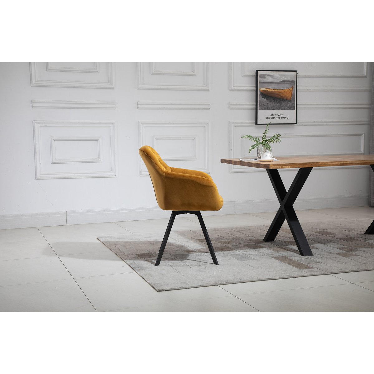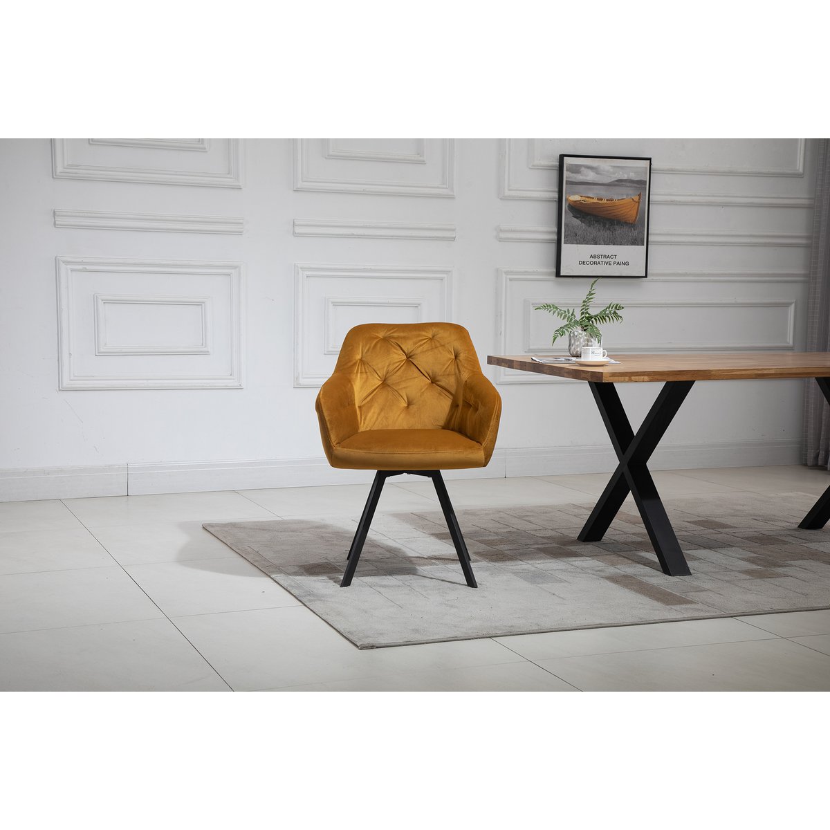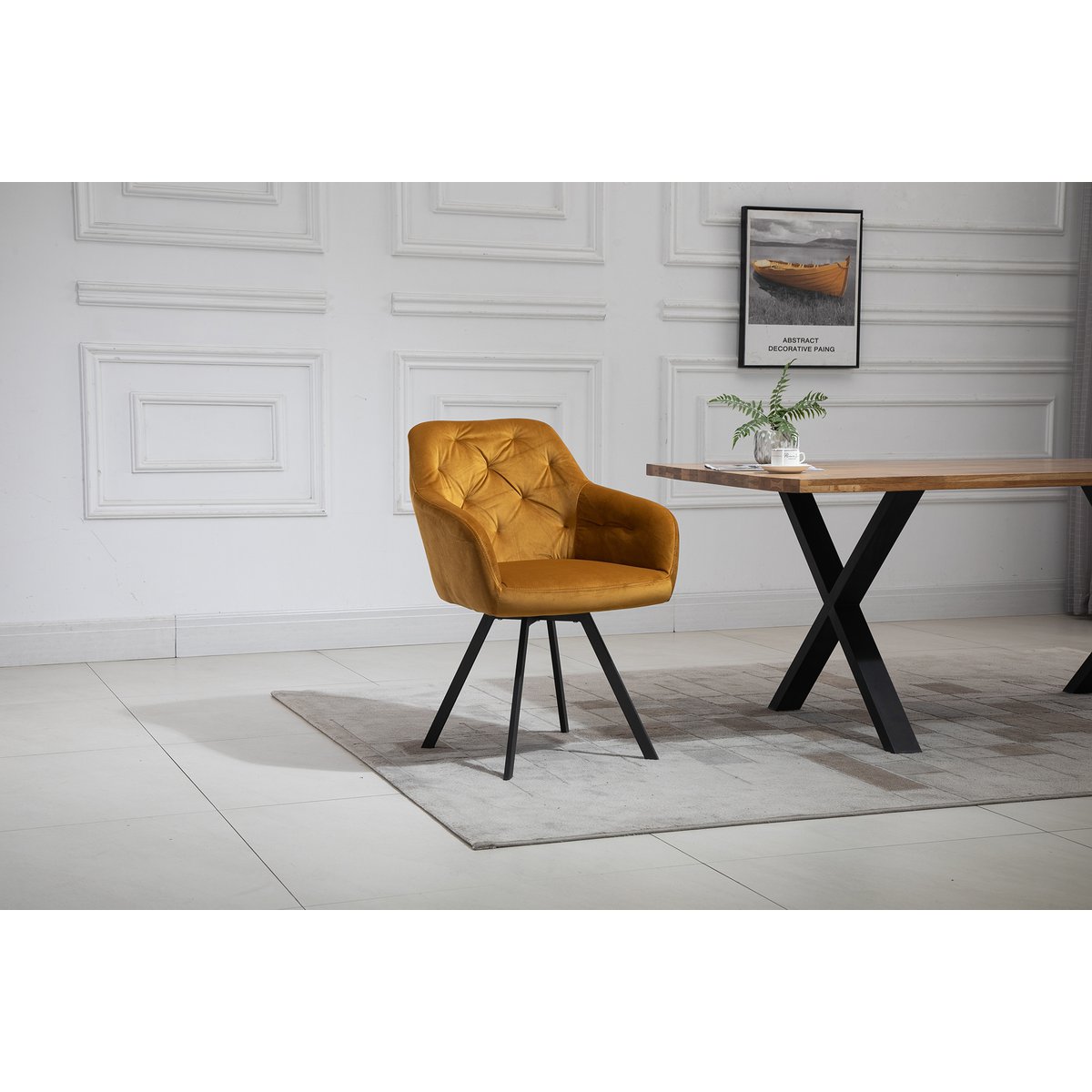 De vier fauteuils zorgen voor een elegante tegenhanger van het robuuste hout. De velvet bekleding, decoratieve knopen in de rug en de comfortabele armleuningen geven de stoelen een chique uitstraling. De 360 graden draaifunctie voegt extra comfort en bewegingsvrijheid toe.