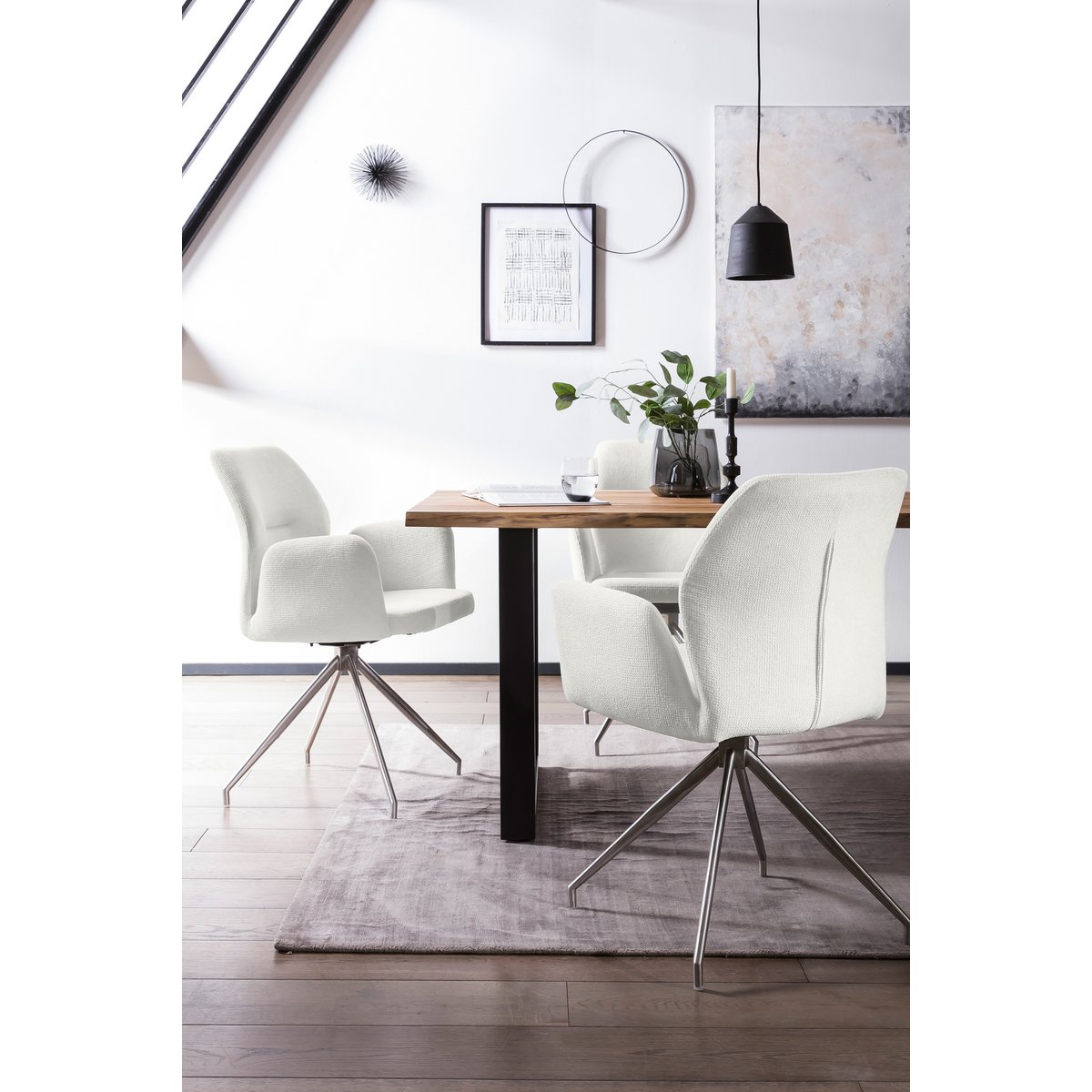 De vier fauteuils hebben een modern ontwerp met 180 graden draaifunctie en een verfijnd frame van roestvrij staal. De beige structuurstof, ergonomisch gevormde rugleuning en licht uitlopende armleuningen zorgen samen voor een comfortabele en stijlvolle zitplek.