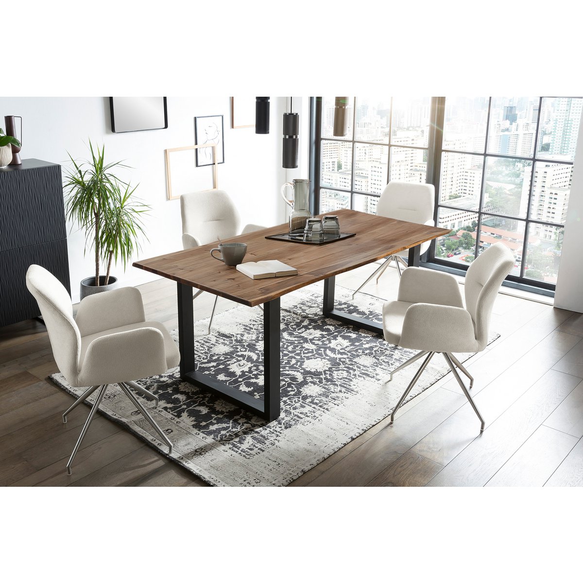 Deze 5-delige eetgroep combineert natuurlijke materialen met modern zitcomfort. De eettafel is gemaakt van massief acaciahout en behandeld met OSMO hardwaxolie in een satijnen walnootkleurige afwerking. Daardoor is het blad beter beschermd tegen water, vuil en slijtage. De echte boomrand geeft de tafel extra karakter en een natuurlijke uitstraling.