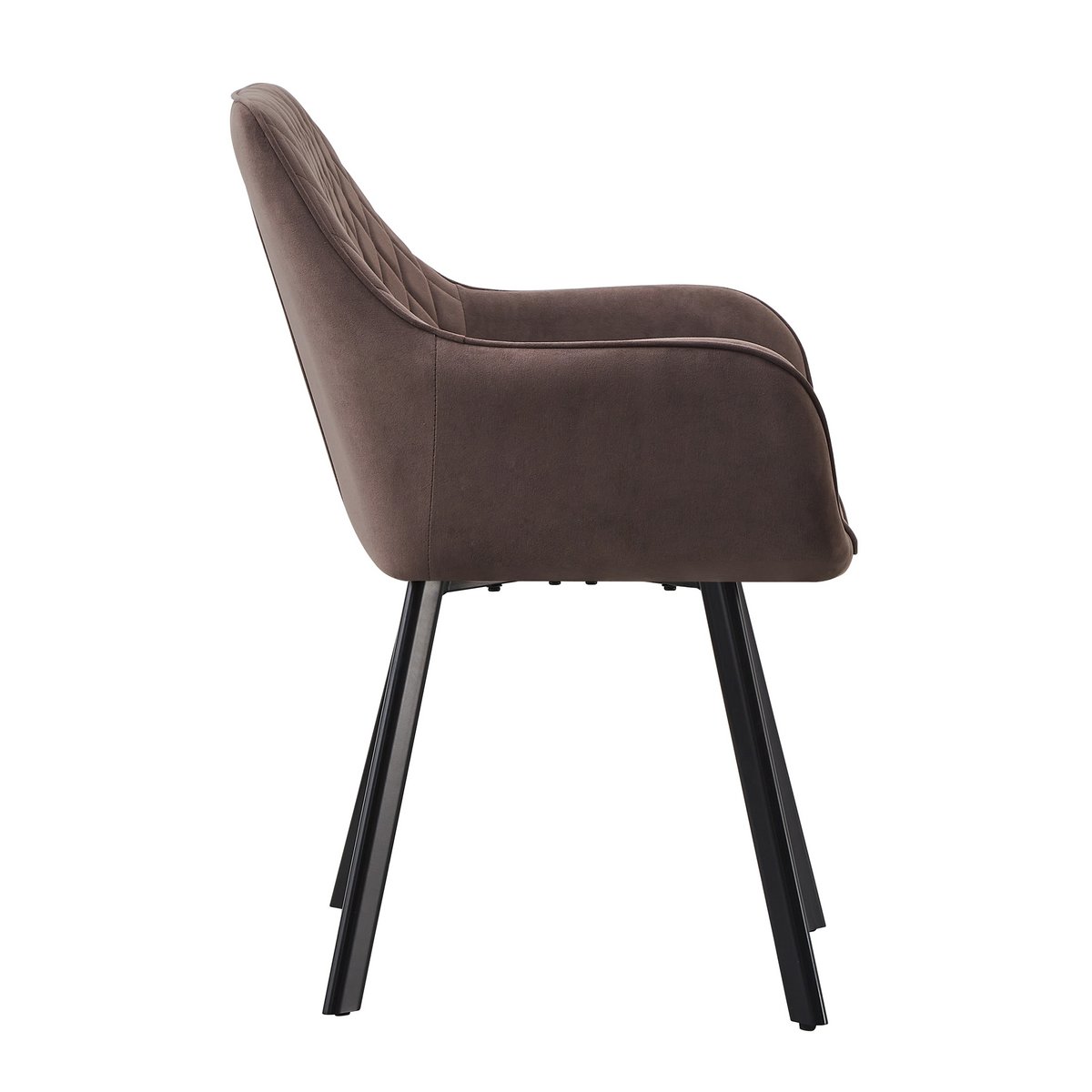 De vier fauteuilstoelen zijn bekleed met een zachte matte velvet stof en voorzien van decoratieve stikdetails aan de binnenzijde. Door de afgeronde vormen, armleuningen en fijne rughoogte bieden de stoelen veel comfort. De warme bruine bekleding sluit mooi aan bij het houten tafelblad en zorgt voor een rustig, stijlvol geheel.