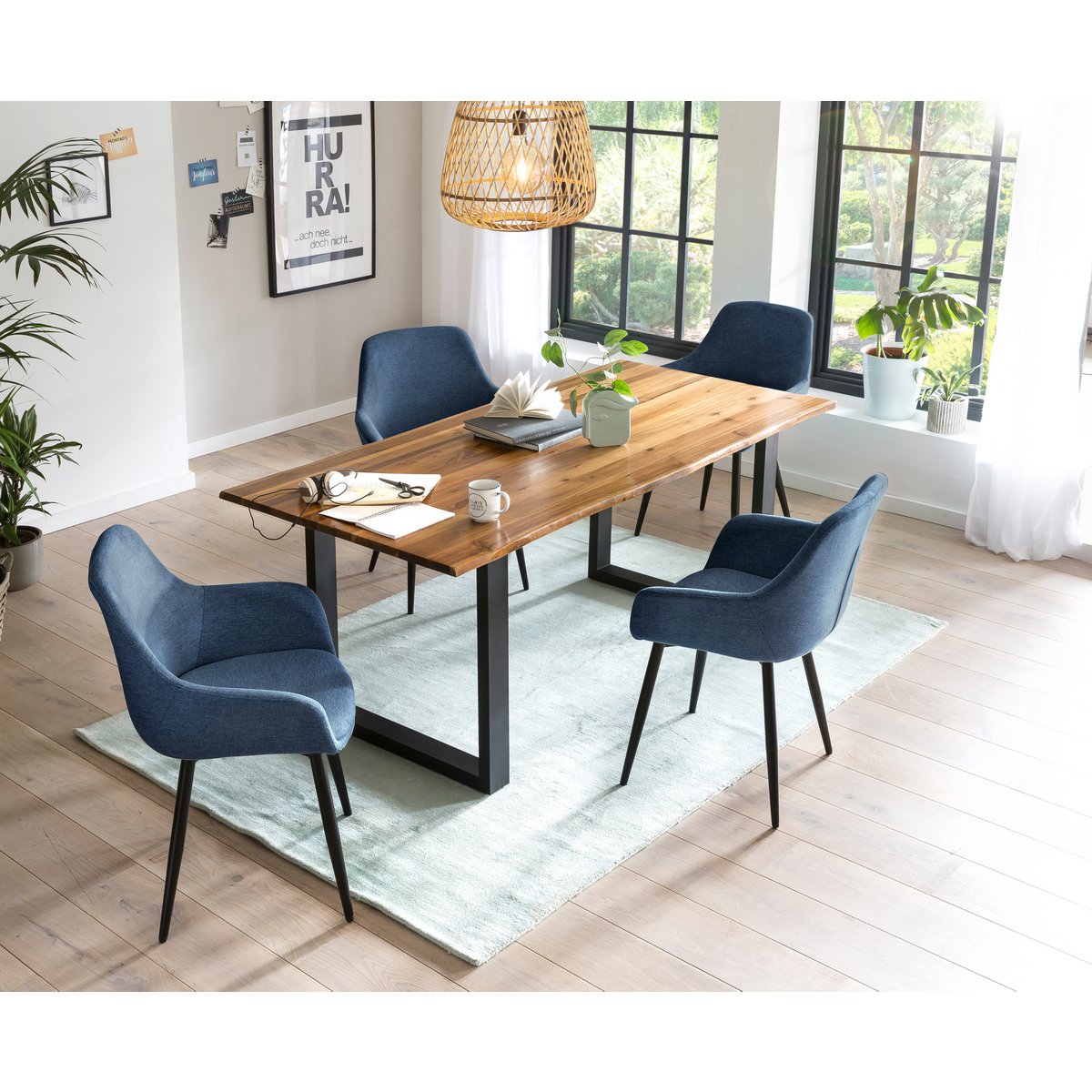 De eettafel is voorzien van een 26 mm dik blad van massief acaciahout en afgewerkt met een echte boomrand. Dit geeft het meubel een natuurlijke en karaktervolle uitstraling. Het stevige U-frame van zwart gelakt metaal zorgt voor uitstekende stabiliteit en vormt een mooi contrast met het warme hout. Omdat het om een natuurproduct gaat, kunnen knoesten, kleurverschillen en kleine afwijkingen voorkomen. Dit zijn geen gebreken, maar kenmerken die iedere tafel uniek maken.