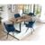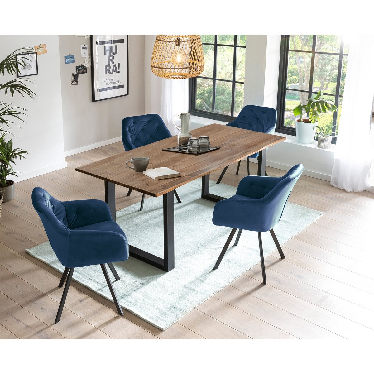 Deze 5-delige eetkamerset combineert vintage flair met een glamoureuze uitstraling en vormt een stijlvolle blikvanger in iedere eetkamer. De set bestaat uit een eettafel van massief acaciahout en vier elegante armleunstoelen met een luxe fluwelen bekleding. De warme walnootkleur van het hout in combinatie met de blauwe stoelen en het zwarte metalen onderstel zorgt voor een chique en eigentijdse uitstraling.