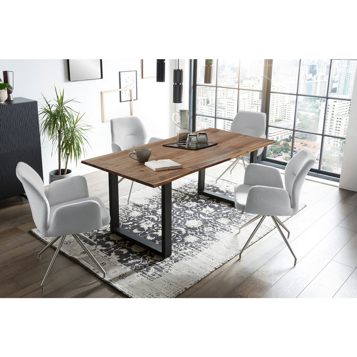 De bijpassende armstoelen bieden een moderne uitstraling en extra comfort dankzij hun 180° draaifunctie. De stoelen zijn bekleed met een elegante structuurstof en hebben een ergonomisch gevormde rugleuning met sierstiksels, een rechte zitting en licht uitlopende armleuningen. Het slanke frame van roestvrij staal geeft de stoelen een verfijnde look. Door de duurzame stoffering en comfortabele afmetingen is deze eetset perfect voor lange diners en gezellige momenten aan tafel. Omdat het om een natuurproduct gaat, kunnen noesten en kleurverschillen voorkomen, wat juist bijdraagt aan het unieke karakter van het meubel.