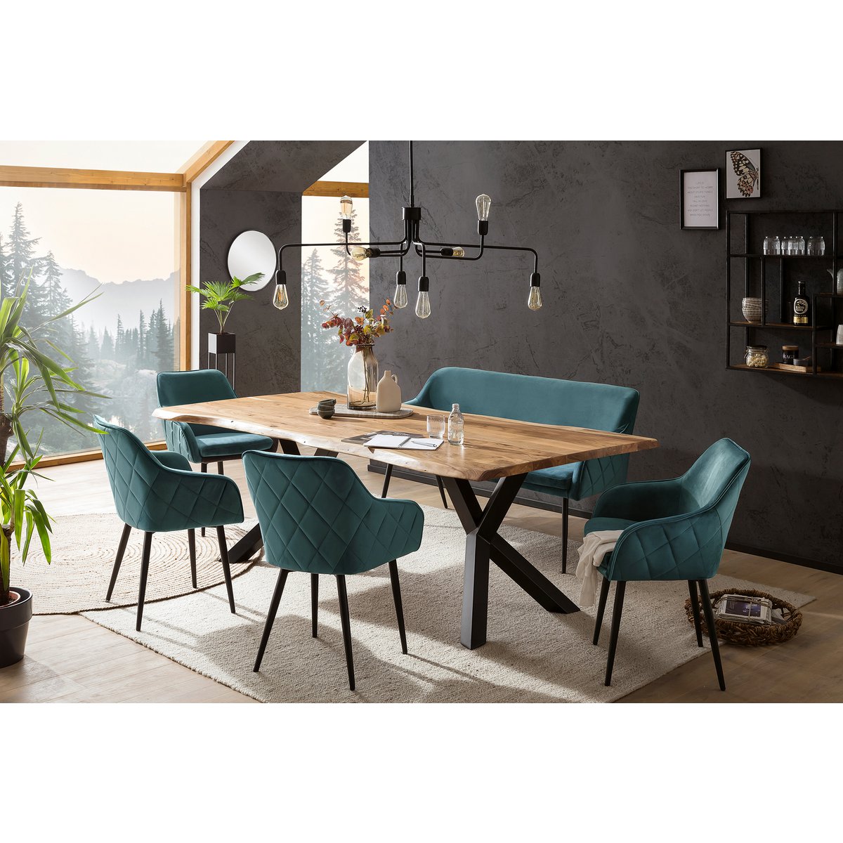 Deze 6-delige eetset combineert een royale massief houten eettafel met luxe velvet zitmeubels. Het 35 mm dikke acaciahouten tafelblad is tweemaal geolied en gewaxd, waardoor het beter bestand is tegen vocht en dagelijks gebruik. Het zwarte metalen Y-frame vormt een stoer contrast met het warme hout en geeft de tafel een stabiele basis.