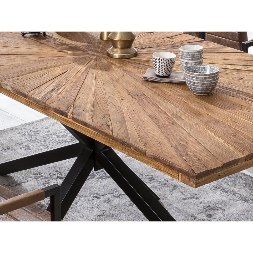 Het antiek zwarte metalen onderstel vormt een stoer contrast met het warme hout en geeft de tafel een industriële uitstraling. Hierdoor combineert deze eettafel gezelligheid met een krachtige, moderne look. De tafel is ideaal als centrale plek in de eetkamer waar u samenkomt met familie en vrienden voor diners, gesprekken en gezellige momenten.