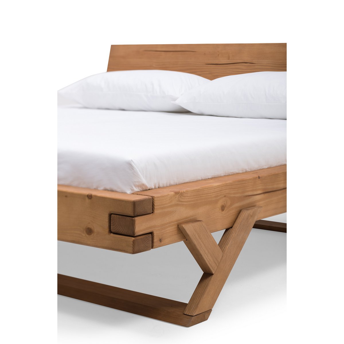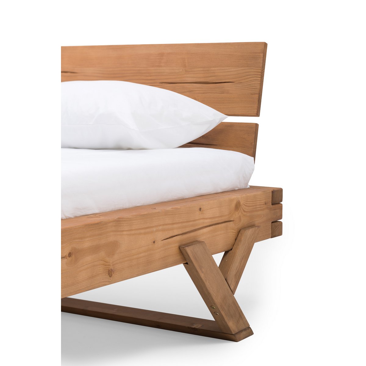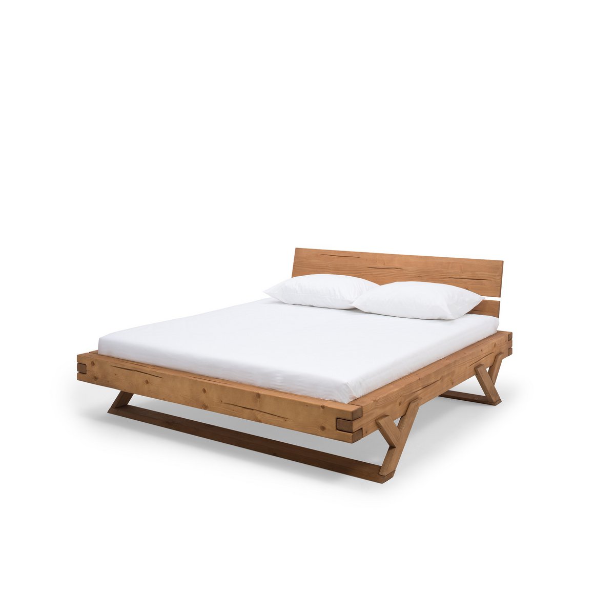 Met dit rustieke balkenbed van hoogwaardig massief hout komt rustieke gezelligheid in de slaapkamer thuis. Het robuuste bedframe van massief sparrenhout brengt een geconcentreerde lading natuur in uw huis en zorgt voor stabiliteit en een lange levensduur. Vurenhout is een populaire keuze voor massief houten meubelen dankzij de levendige structuur. Groeischeuren en knoestgaten in het hout maken het bed tot een fascinerend uniek stuk met een opvallende uitstraling. Een bijzondere blikvanger aan dit balkenbed zijn de karakteristieke hoekverbindingen. Deze onderstrepen niet alleen de solide uitstraling van het bed, ze zorgen ook voor maximale veerkracht. Het frame met Y-poten en de schuine houten lopers zorgen voor een moderne twist. De solide uitstraling van het houten bed wordt bovendien losgemaakt door het gedeelde hoofdbord. Het massieve bed combineert op charmante wijze moderne stijl en traditionele productiemethoden in een duurzaam meubelstuk. Met dit balkenbed haalt u een bijzonder onderhoudsvriendelijk meubelstuk in uw eigen vier muren. Het geoliede oppervlak is zeer onderhoudsvriendelijk, duurzaam en beschermt het hout tegen stof en vuil. Veeg kleine vervuilingen weg met een vochtige doek. Hoogte van het hoofdbord: 49 cm, breedte van het hoofdbord: 160 cm, hoogte van vloer tot onderkant: 25 cm, hoogte van vloer tot bovenkant: 41 cm, inloopdiepte lattenbodem: 12 cm, geolied vurenhout, zonder lattenbodem en matras, bedframe met middenstijl maakt gebruik van één grote of twee kleine lattenbodems mogelijk, liggerdikte 16×9 cm.