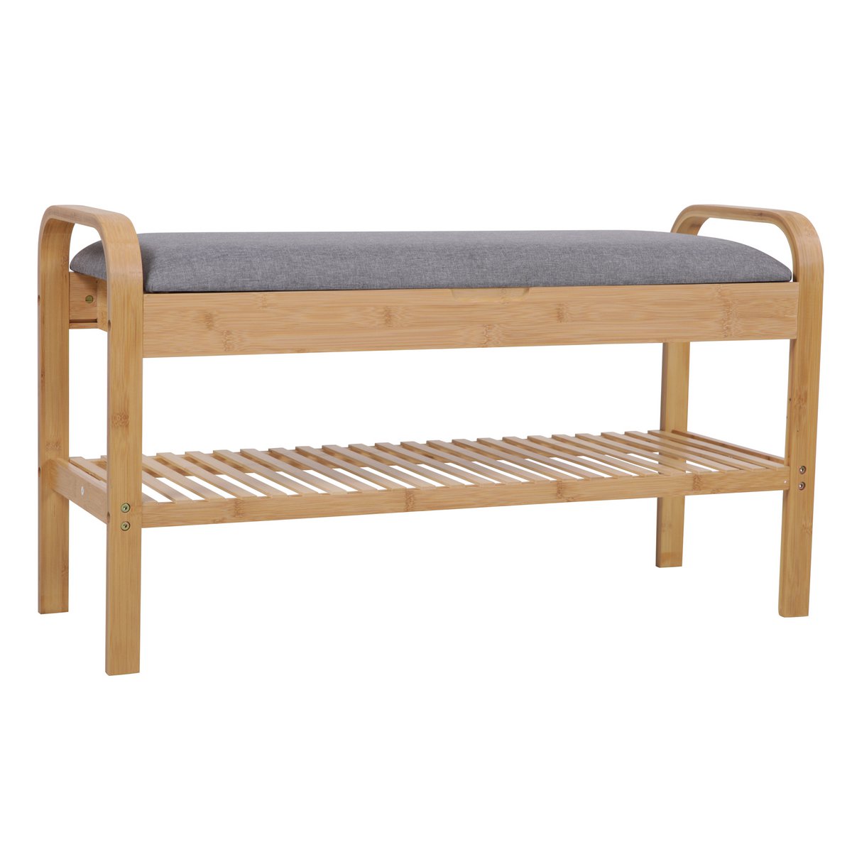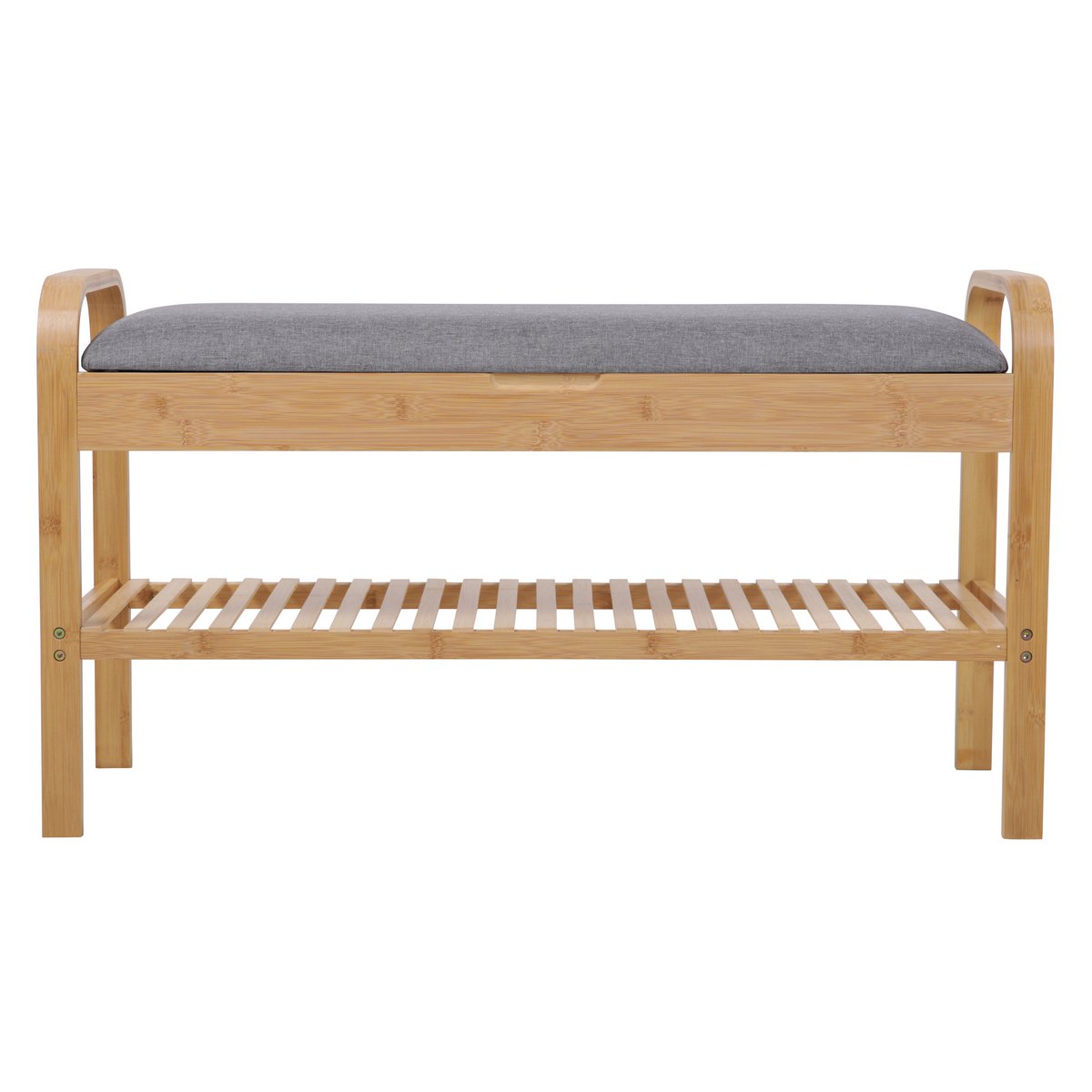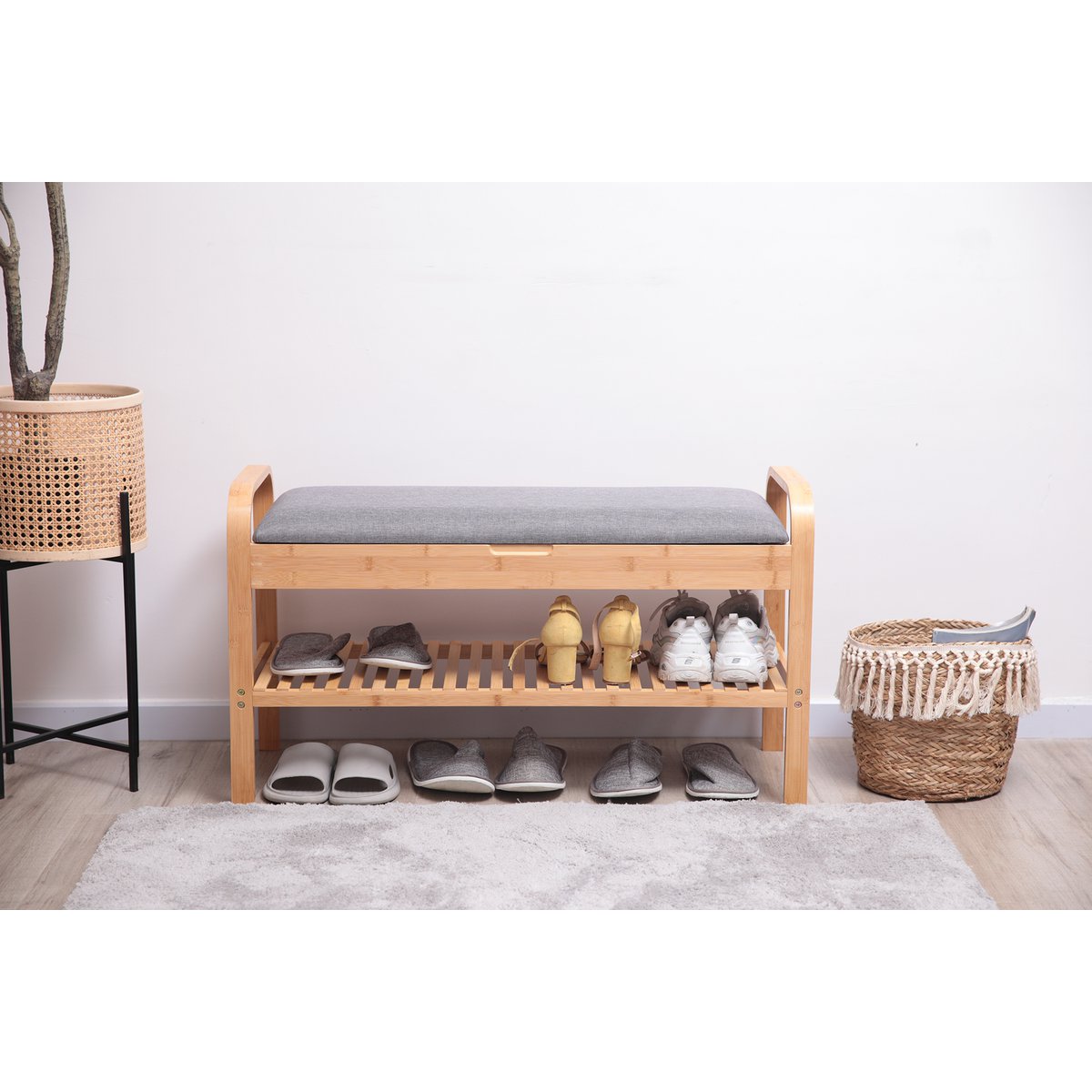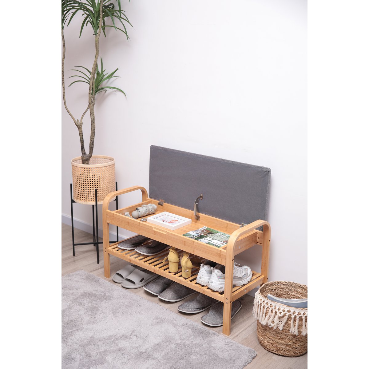 Onder het uitklapbare zitkussen bevindt zich bovendien handige verborgen opbergruimte voor kleine dagelijkse spullen. De open ruimte onder de zitting biedt plaats aan maximaal 5 paar schoenen, zodat je entree netjes en georganiseerd blijft. Het eenvoudige ontwerp van natuurlijk bamboe en grijze stof past moeiteloos in uiteenlopende interieurstijlen.