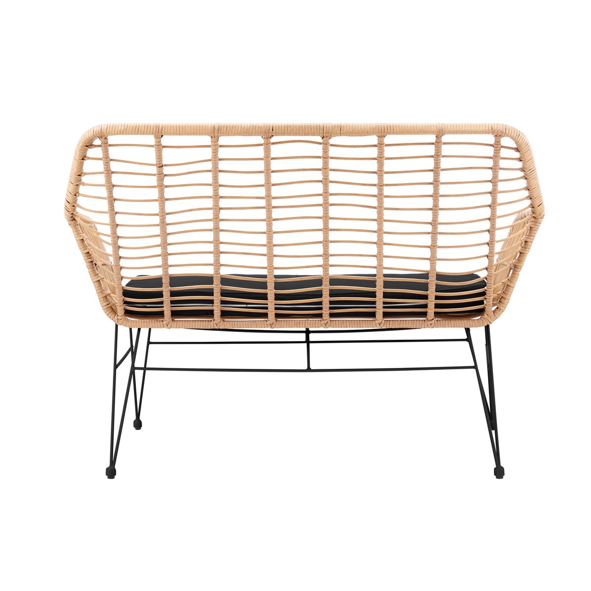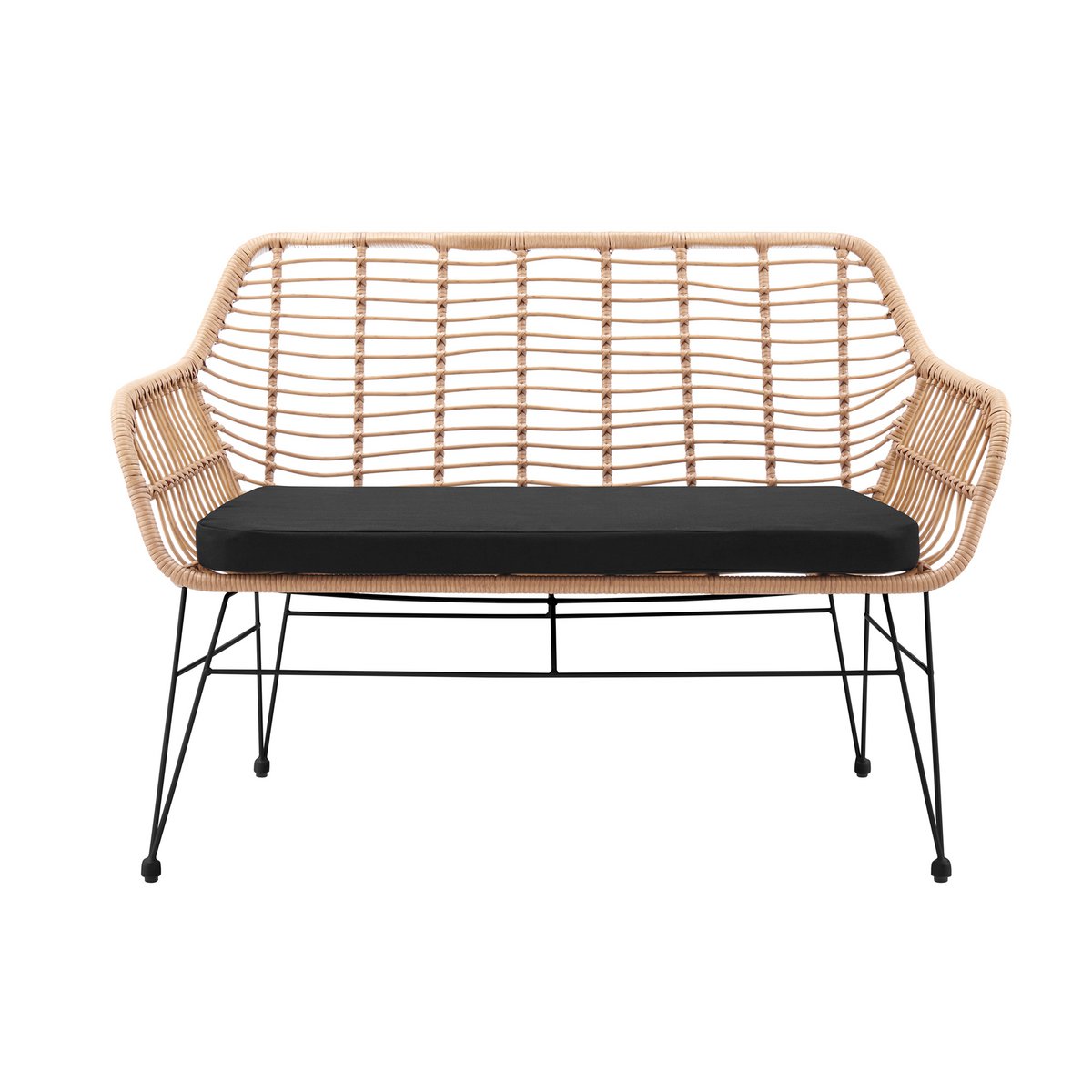 De trendy bank overtuigt door zijn zitting en rugleuning in natuurlijke rotan-look en een stevig metalen frame in zwart. Deze bank is weerbestendig en daardoor geschikt voor binnen- en buitengebruik. Het stevige metalen frame zorgt niet alleen voor een stabiele stand, maar biedt ook een mooi contrast met de rotan look. De comfortabele zitschaal, gemaakt van 100% polypropyleen, zorgt voor een aangenaam zitcomfort. Een extra zitkussen in zwart maakt de look compleet. Een vleugje vakantiegevoel voor uw woon- of tuingedeelte! Zitschaal van 100% polypropyleen, metalen frame met poedercoating, weerbestendig, geschikt voor binnen en buiten, zitbreedte ca. 108 cm, zitdiepte ca. 48 cm, zithoogte ca. 66 cm , max. draagvermogen 200 kg, Maximaal 2 personen.