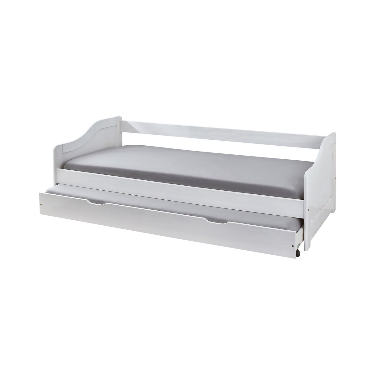Kinderkamermeubels die interessant en speels zijn, zijn vooral populair bij kleine fans van interieurdesign. Het eenpersoonsbed, geschikt voor matrassen van 90×200 cm, biedt extra ruimte voor overnachtende gasten. Het bed heeft een lade die gebruikt kan worden als extra opbergruimte voor het opbergen van speelgoed, kleding of beddengoed of kan worden omgebouwd tot een praktische tweede slaapplaats met een extra matras. De bedlade loopt op wieltjes, waardoor verplaatsen kinderspel is. Ouders zullen ook dol zijn op het bed van massief grenenhout. Door de robuustheid van het hout kan het bed uw kinderen tot ver in de volwassenheid van dienst zijn. Het eenpersoonsbed met extra bed is ook een goede keuze voor gastenkamers en kleine appartementen. De witte afwerking past harmonieus in veel interieurs. inclusief lattenbodem, levering zonder matras, hoogte van het matras in de lade: max. 10 cm, zithoogte ca. 37 cm, de lade kan gebruikt worden als opbergruimte of als extra bed, lade op wielen