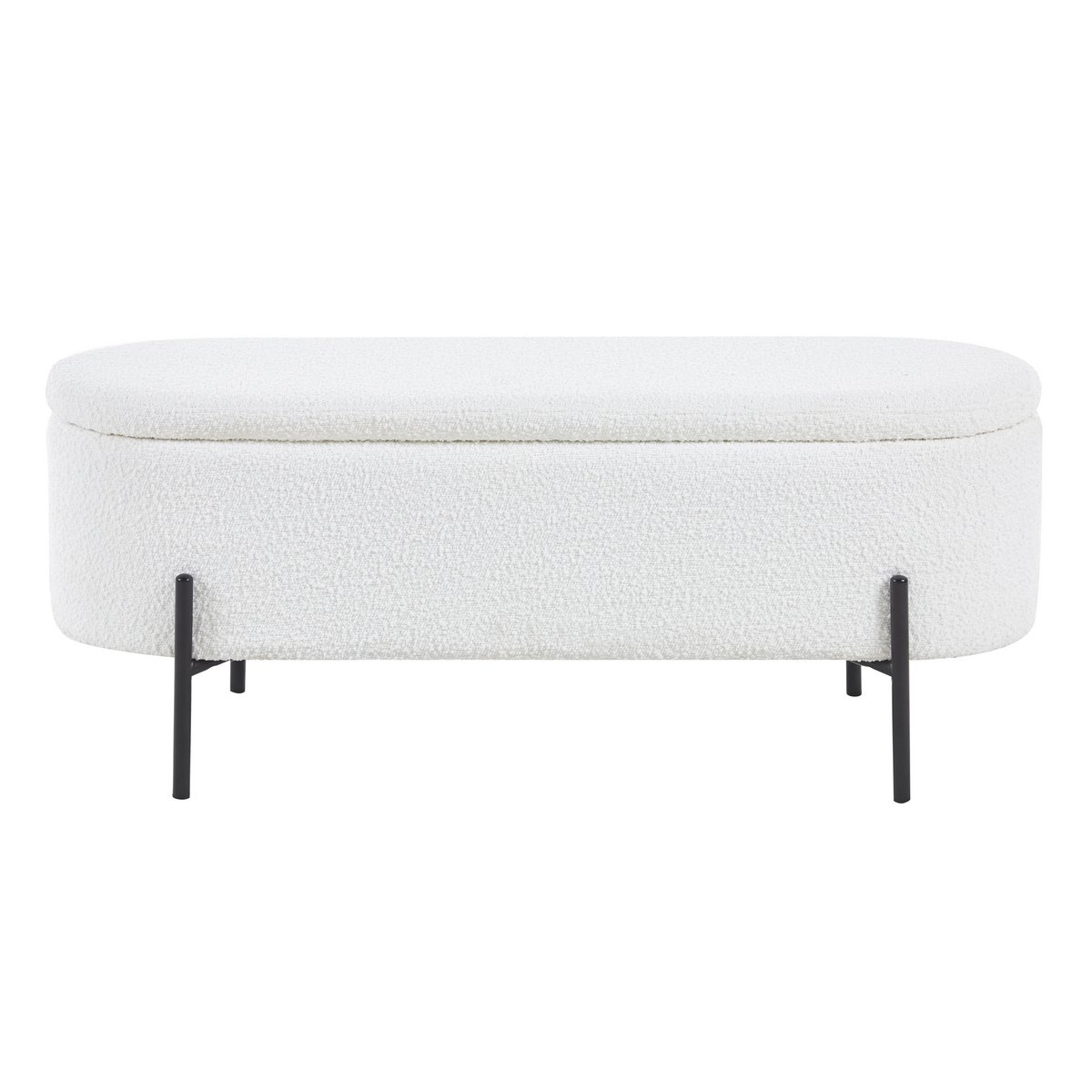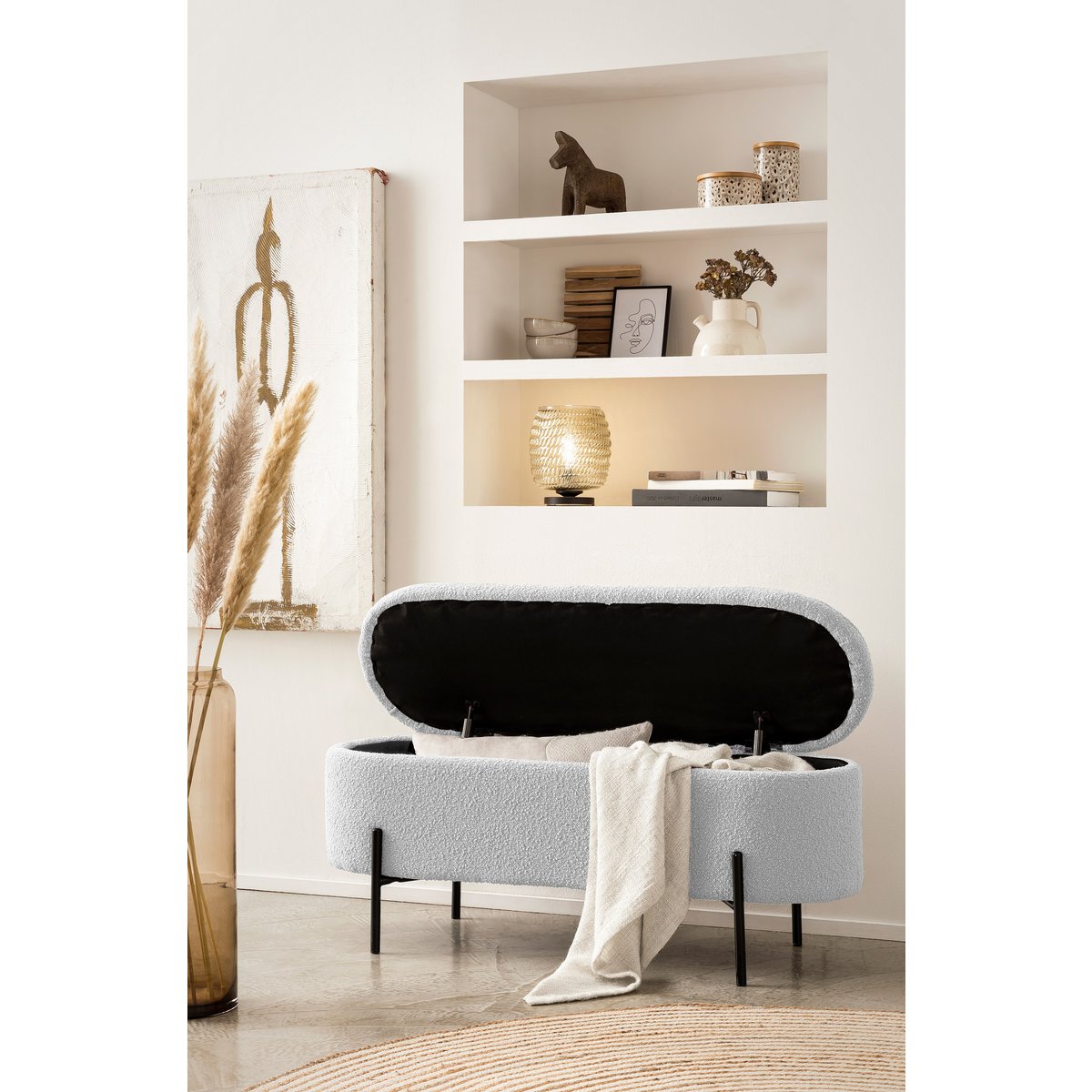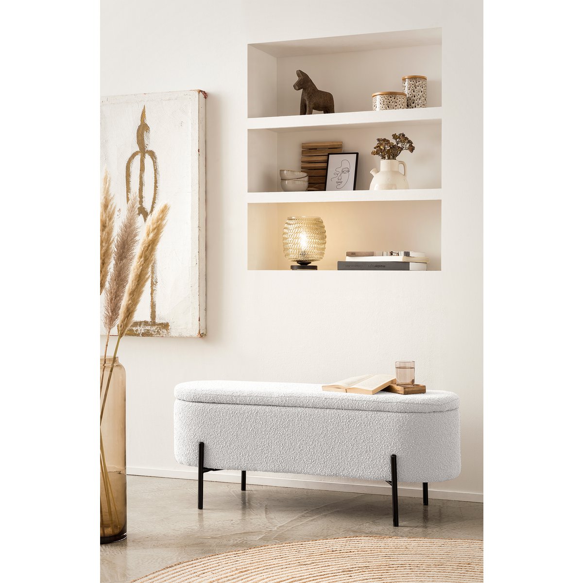 Als je op zoek bent naar Scandinavisch design met praktisch nut, dan is dit bedbankje met trendy bouclé hoes de juiste keuze. De poef overtuigt niet alleen door zijn geavanceerde design, maar biedt ook een slimme opbergruimtefunctie achter het klapdeksel. Of het nu gaat om dekens, dekbedovertrekken of kleding – je kunt het bedbankje gebruiken om op een stijlvolle manier orde te scheppen en rondslingerende spullen op te bergen. De boucléstof, die al lang zijn weg vindt naar onze woon- en slaapkamers, straalt warmte en geborgenheid uit. Bovendien weerspiegelt de stof met zijn wollige uitstraling vakkundig de essentie van de populaire Scandi-stijl. Het design frame met hoge voet is gemaakt van gepoedercoat zwart metaal en maakt de look helemaal af. traploos in de kamer verstelbaar, zithoogte: 44 cm, met vouwelement en opbergruimte binnenin, bekleding: 100% polyester, lichtsterkte hoes: 4, pillinghoes: 5, schuurcycli 100.000, draagvermogen: 120 kg, poten zwart metaal (staal) gepoedercoat.