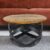 Massief houten salontafel in industriële stijl met karakteristieke zaag- en gebruikssporen. Het stevige onderstel van massief zwart ijzer is gepoedercoat en zorgt voor een robuuste uitstraling.