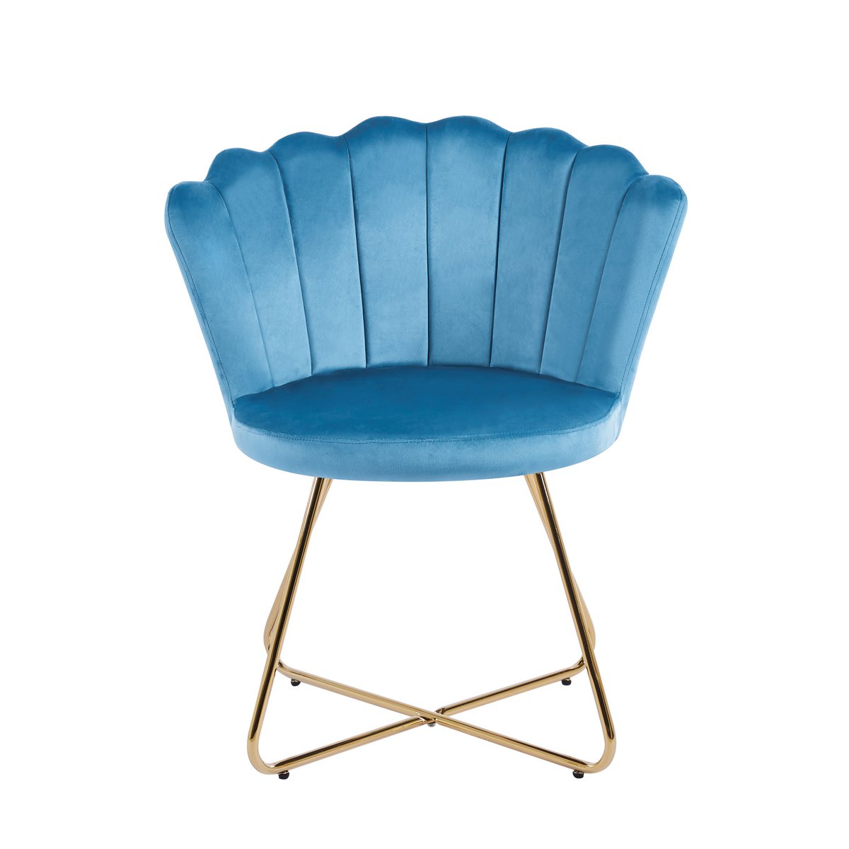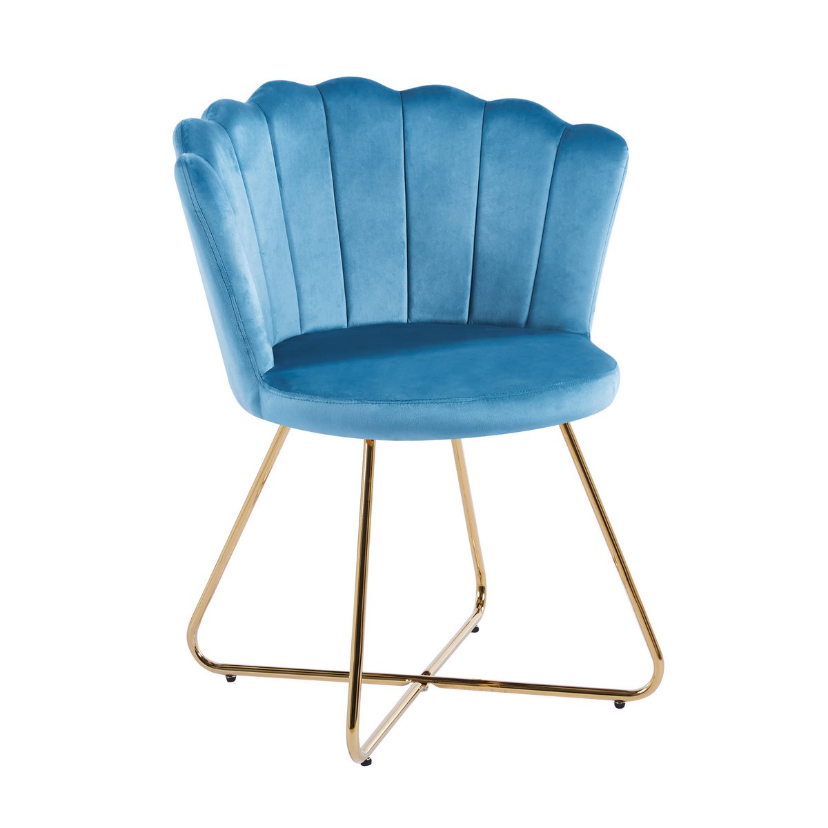 Het goudkleurige metalen kruisframe vormt een chique contrast met de blauwe bekleding en zorgt voor een stevige en stabiele basis. De comfortabele vulling in zitting en rugleuning biedt een aangenaam zitgevoel, terwijl het royale formaat extra comfort toevoegt. Door de combinatie van luxe materialen, zachte vormen en een opvallend onderstel is deze stoel een stijlvolle keuze voor wie comfort en uitstraling wil combineren.