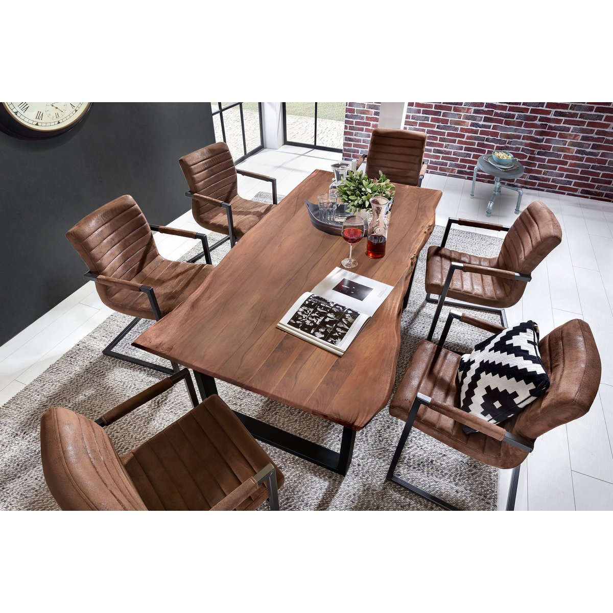 Geen enkele boomrandtafel is hetzelfde, dat is de natuurlijke uniciteit die u met deze eettafel direct in uw huis kunt plaatsen. De tafel biedt voldoende ruimte voor maximaal 8 stoelen om samen te ontbijten, lunchen en dineren. Het tafelblad van echte boomranden, “asgrown”, acacia in de kleur walnoot staat in een opmerkelijk harmonieus contrast met het zwart stalen sledeonderstel en maakt elk buffet in de eetkamer tot een succes. Het natuurlijke oppervlak van de tafel geeft de tafel zijn rustieke design en maakt het toch mogelijk om hem gemakkelijk te integreren in moderne meubels als keukentafel in een open keuken-woonkamer. Of het nu om een keuken, eetkamer of woon-eetkamer gaat, er zijn geen grenzen aan de manier waarop het kan worden gecombineerd met ander bestaand meubilair, of het nu vintage, industriële look of shabby chic is, en maakt van elke maaltijd een feest. Plaatdikte 26 mm, bestaande uit ca. 5-8 planken (meestal 7 stuks), framebreedte 74 cm, afmeting van de 4kt buis 8×4 cm, met 2 stelschroeven voor hoogteverstelling, er zitten 3 noklijsten onder de plaat , afstand tussen de poten 103 cm, houten oppervlak 2 x geverfd en in de was gezet.