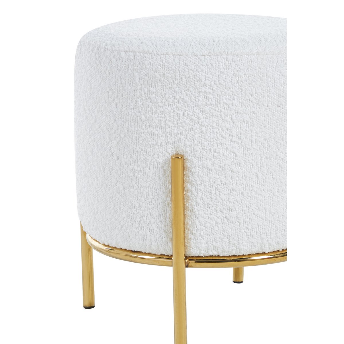 Deze compacte kruk in bouclé look is een stijlvolle oplossing voor extra zitruimte in huis. De zachte witte stof geeft de kruk een lichte en gezellige uitstraling, terwijl het goudkleurige metalen frame zorgt voor een elegante en moderne touch. Daardoor past deze kruk goed in zowel Scandinavische als eigentijdse interieurs.