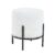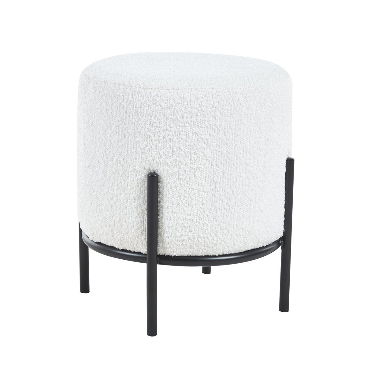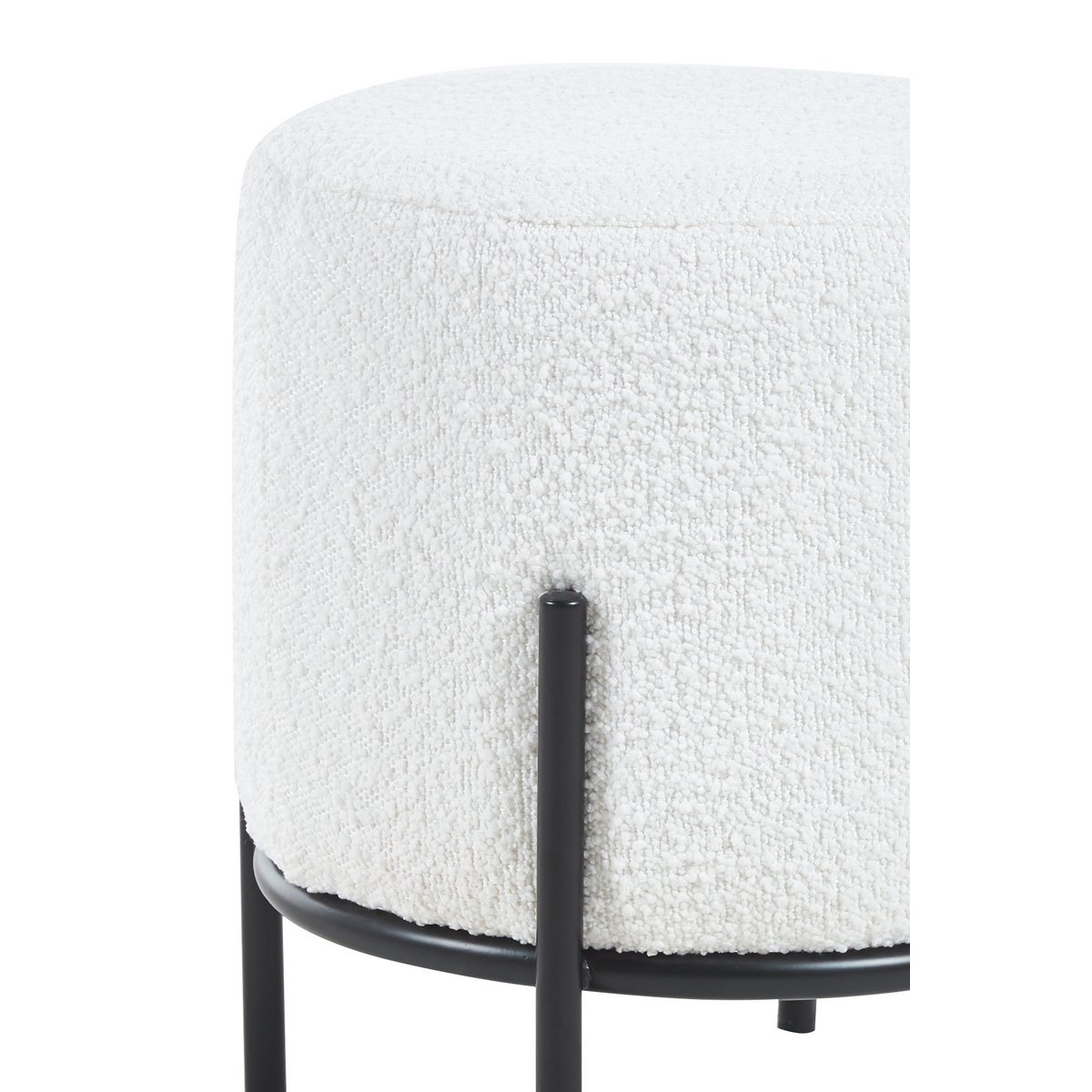 Deze compacte kruk in bouclé look combineert een zachte uitstraling met een strak modern frame. De witte stof zorgt voor warmte en een lichte sfeer, terwijl het zwarte metalen onderstel een krachtig contrast vormt. Zo past de kruk moeiteloos in Scandinavische en moderne interieurs.