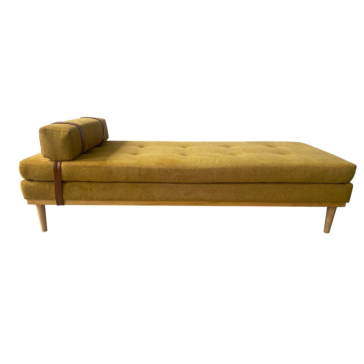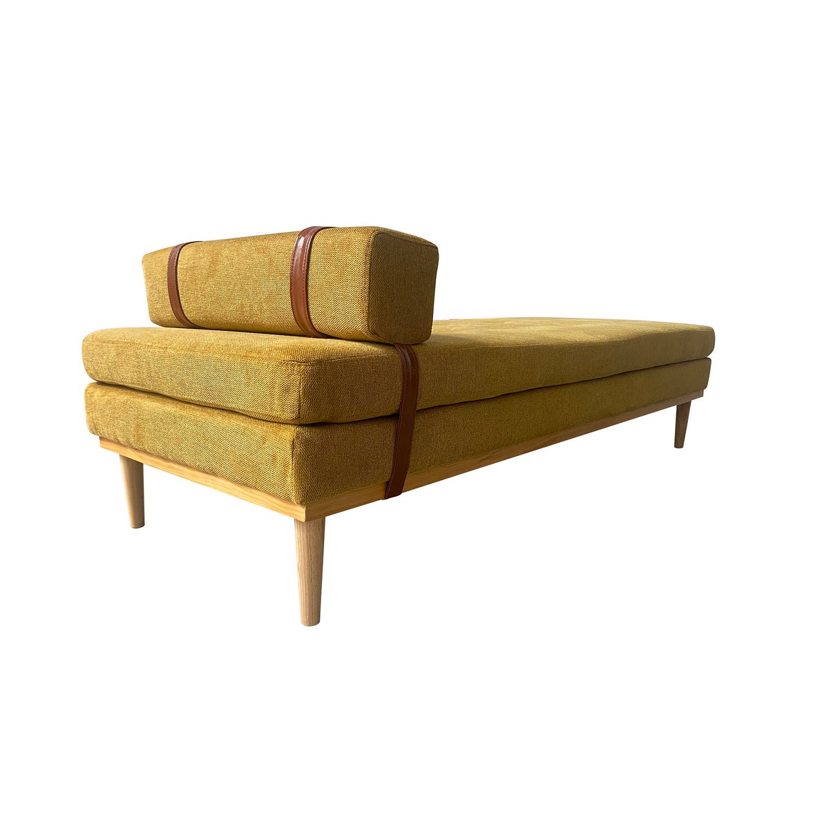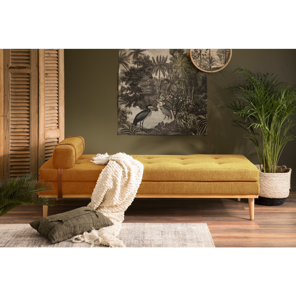 Dit daybed in gele structuurstof is een opvallend en stijlvol meubelstuk dat direct warmte en karakter toevoegt aan je interieur. De combinatie van de levendige stof met het natuurlijke houten frame zorgt voor een mooi contrast en maakt dit daybed tot een echte blikvanger in de woonkamer, serre of leeshoek.