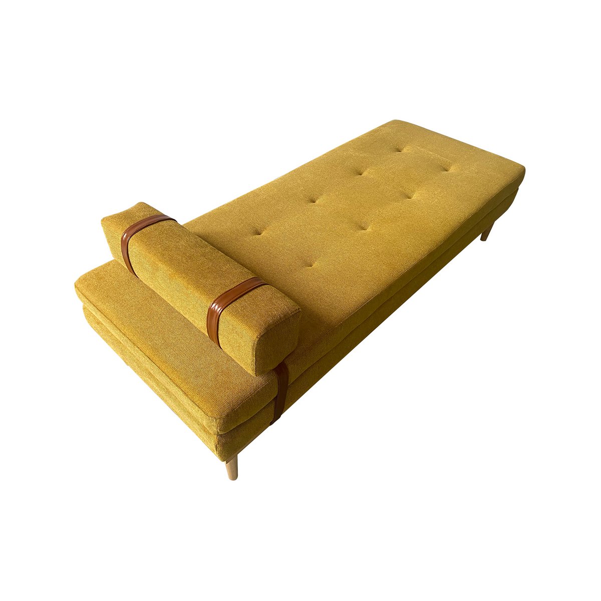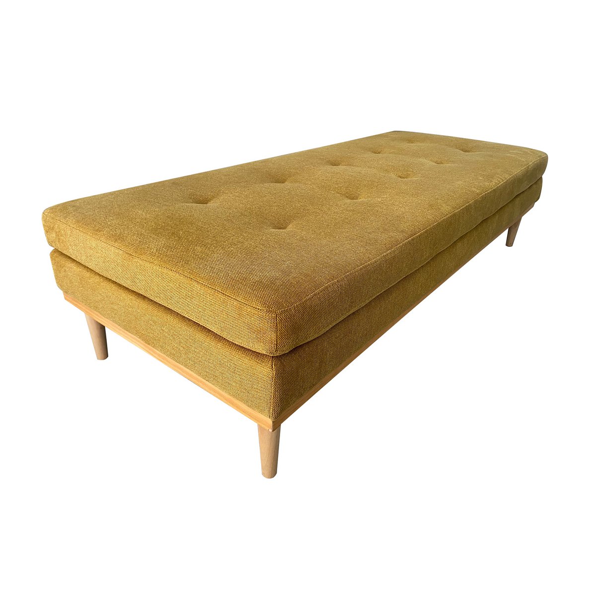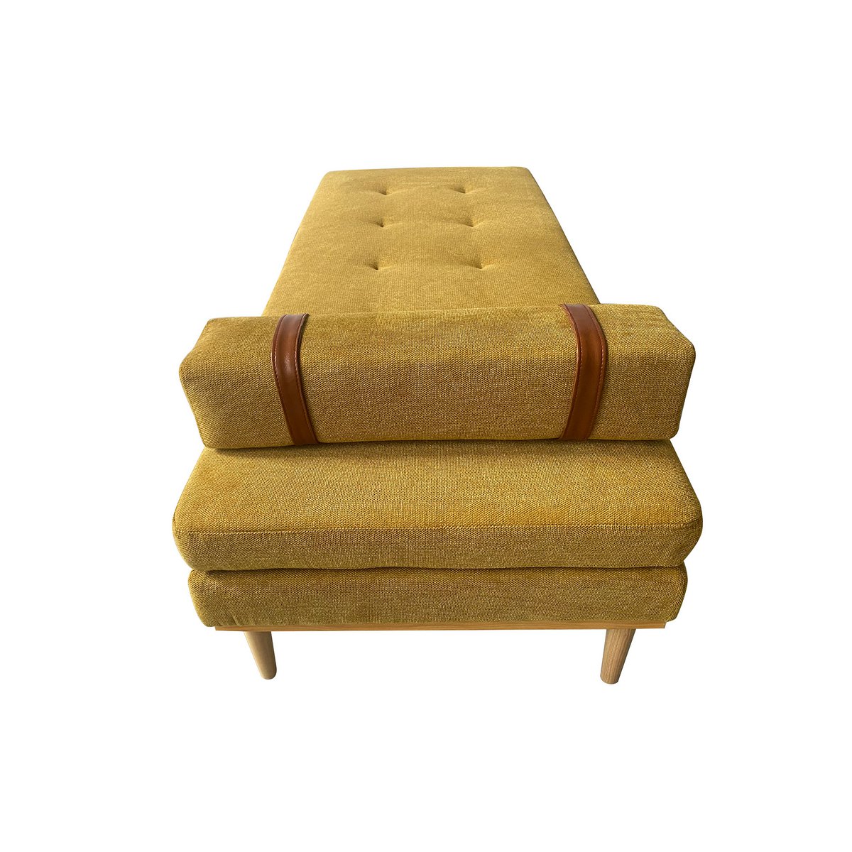 Dit daybed in gele structuurstof is een opvallend en stijlvol meubelstuk dat direct warmte en karakter toevoegt aan je interieur. De combinatie van de levendige stof met het natuurlijke houten frame zorgt voor een mooi contrast en maakt dit daybed tot een echte blikvanger in de woonkamer, serre of leeshoek.