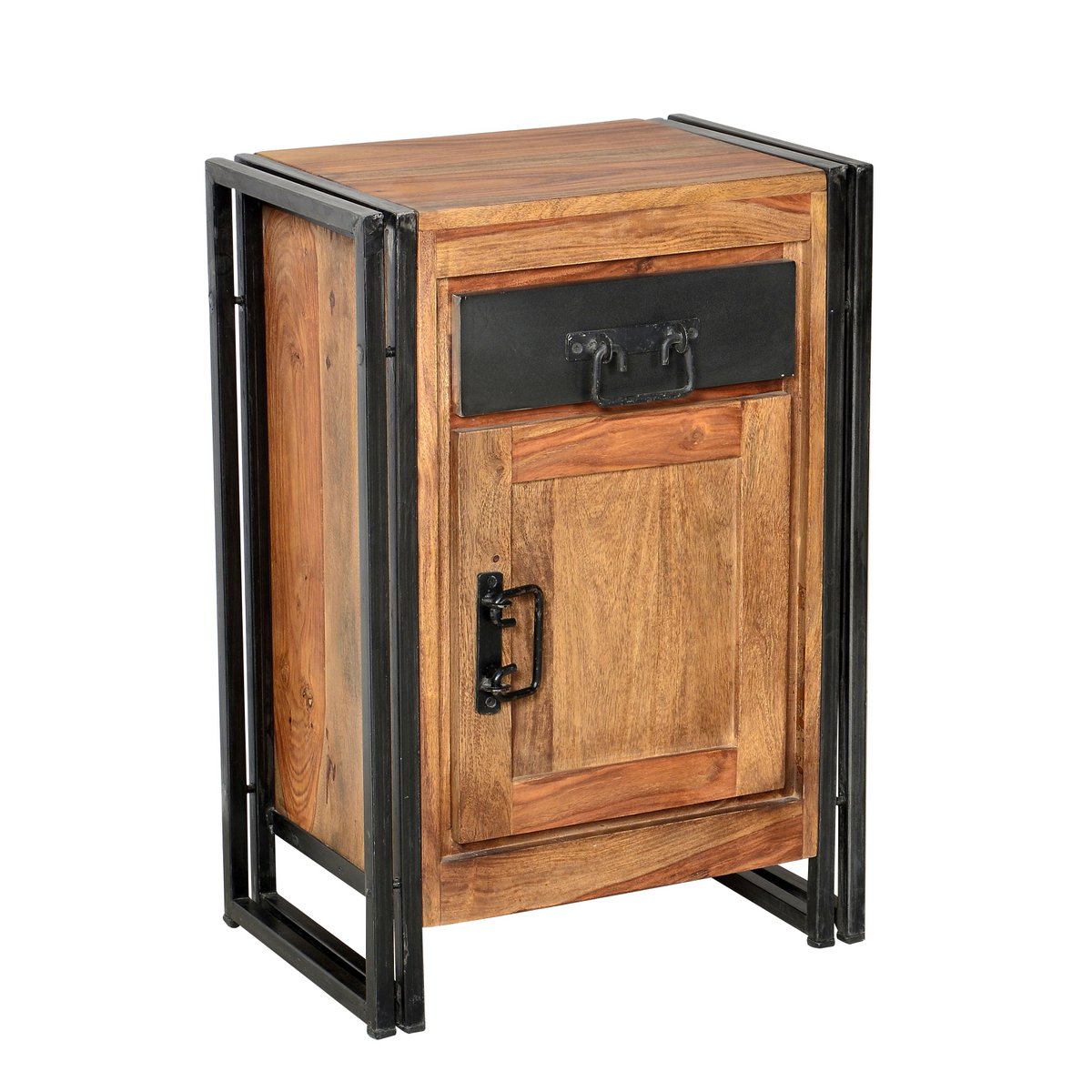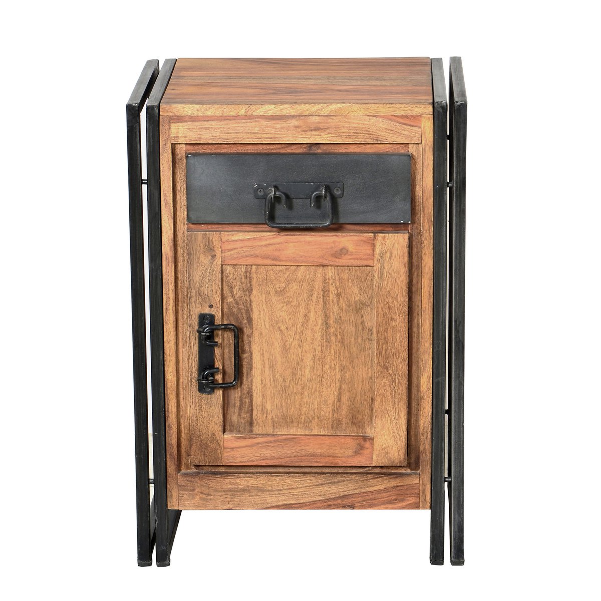 Massief acaciahout ontmoet industriële metalen hardware in deze compacte ladekast. Met een breedte van 50 cm vind je voldoende ruimte. Er is opbergruimte voor alledaagse spullen in een lade en achter een deur. De acaciahouten body wordt omlijst door een modern metalen frame. De industriële look wordt voortgezet door metalen bevestigingen aan de lade en handgrepen en maakt deze ladekast tot een originele eyecatcher. De structuur van het hout varieert van model tot model, waardoor elke kast uniek is met zijn eigen charme. Of het nu gaat om een blikvanger in een eenvoudige sfeer of als onderdeel van een modern fabrieksdesigninterieur: deze ladekast is een chique aanvulling op vele woonstijlen. De moderne materiaalmix combineert een shabby en industriële look. Deurstopper naar keuze, lade binnenmaat 29,5x26x9 cm, vrije maat achter de deur 31×30,5×32,5 cm