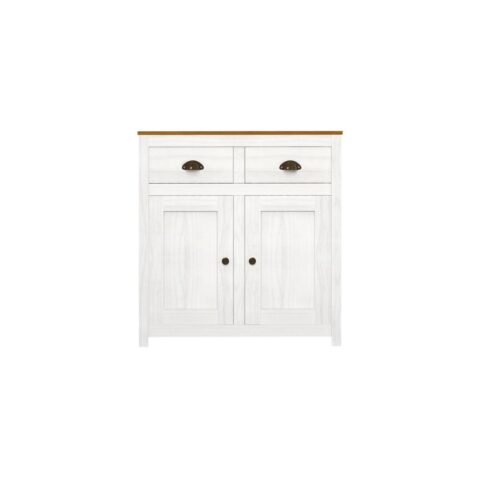 Dit wit gelakte dressoir is gemaakt van massief grenenhout. De afdekplaat is geschilderd in een warme honingtint. De ladekast biedt voldoende opbergruimte voor diverse spullen in 7 lades en achter 3 deuren. De plint heeft een gebogen vorm. Het dressoir is een absolute eyecatcher voor je woonkamer, eetkamer of hal. De zwart gelakte applicaties en decoratieve handgrepen geven dit dressoir net dat beetje extra. Het dressoir ziet er niet alleen chic uit, het dient ook zijn doel.
