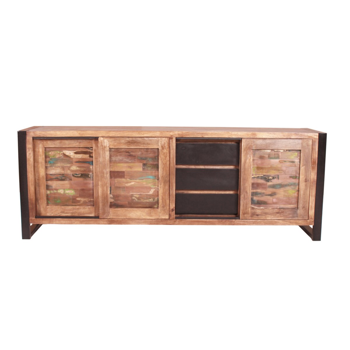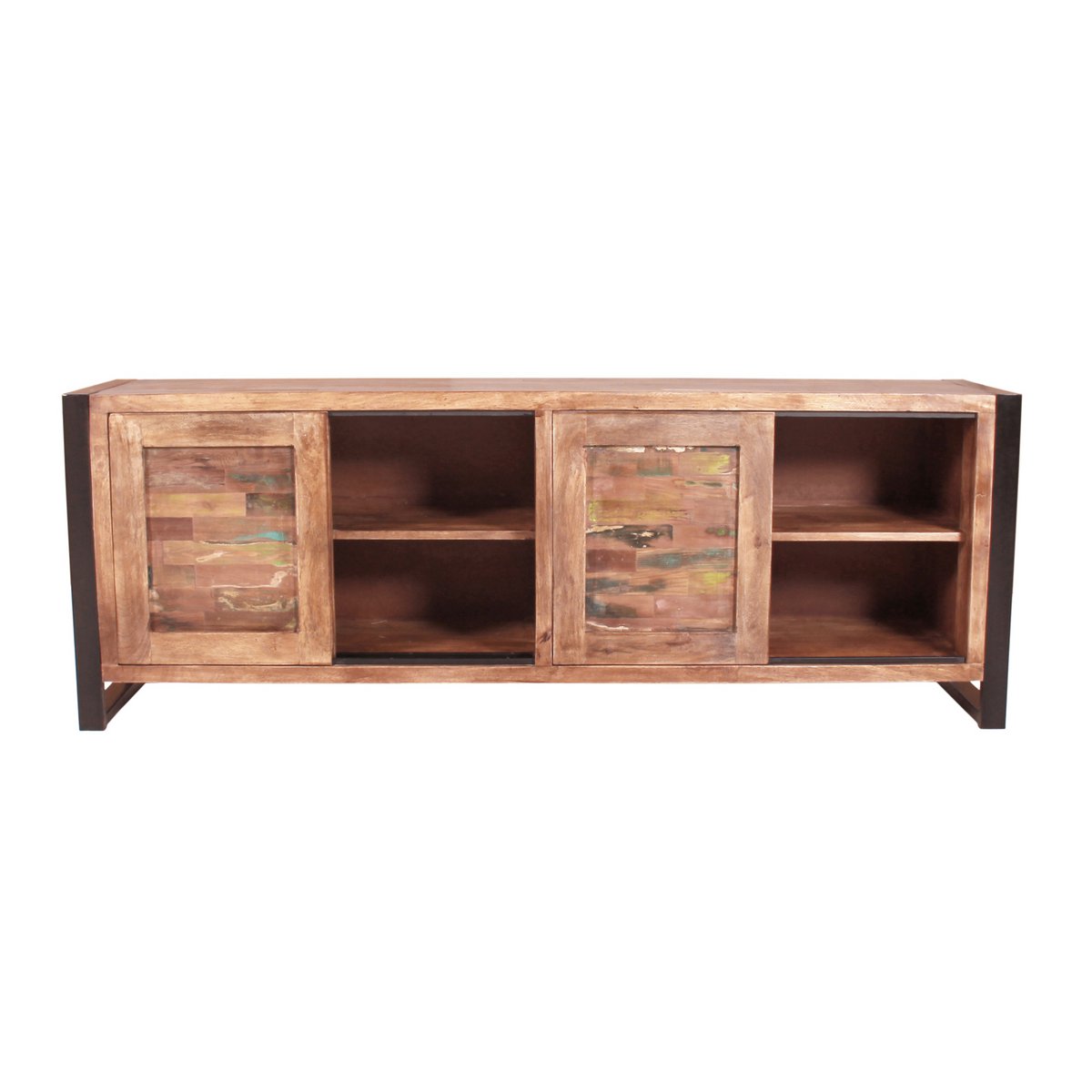 Dit meubelstuk staat voor eigentijds design. Het is cool en casual, maar nog steeds niet te koud. Het gerecyclede hout is afkomstig van oude vissersboten, gesloopte huizen of oude deuren. Door moderne machines in de productie grotendeels te vermijden, krijgt elk onderdeel precies het handgemaakte tintje om als uniek stuk op te vallen tussen de vormeloze massa. Dankzij de schuifdeuren is hij bij dagelijks gebruik verrassend eenvoudig te hanteren. Schoonheid en bruikbaarheid zijn hier geen tegenstrijdigheid. Achter iedere deur een vaste plank, afmeting vak rechts BT 39×36 cm, links 2 x 40×33 cm, boven allemaal 21 cm hoog, onder 23 cm hoog, binnenmaat lade 35x29x12,5 cm, geen kabelgat .