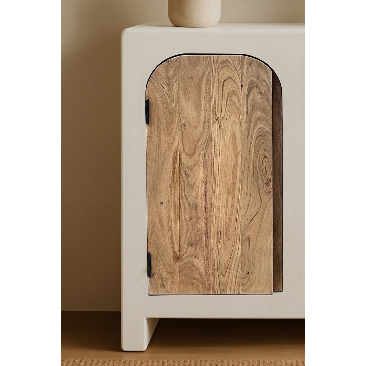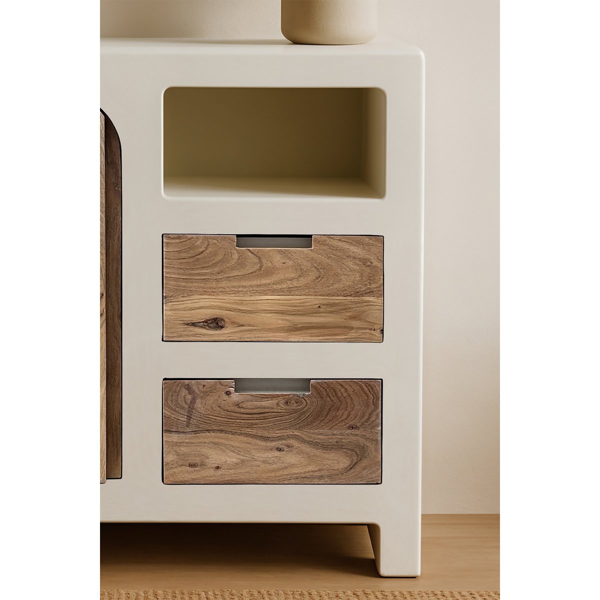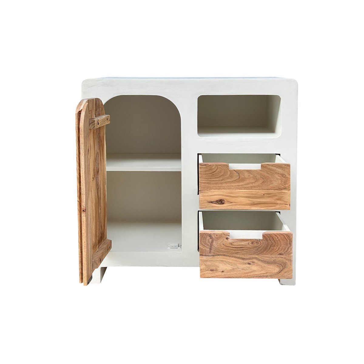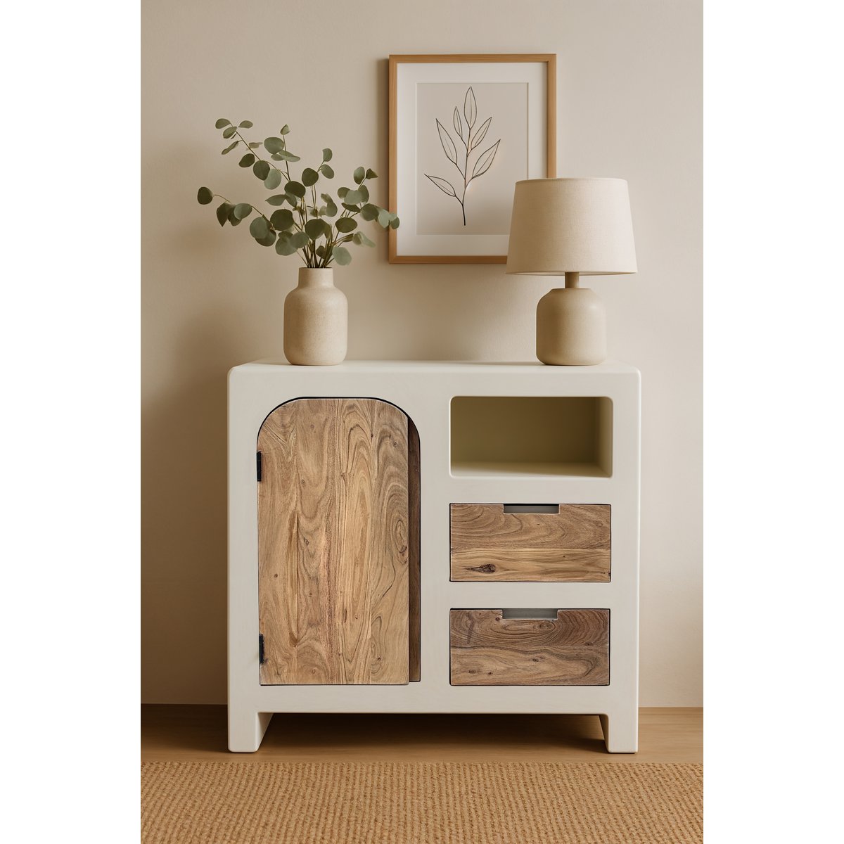Deze ladekast combineert tijdloze helderheid met natuurlijke accenten en brengt Scandinavische flair in het woongedeelte. De romp is gemaakt van hoogwaardig MDF en afgewerkt met elegante kalkpleister in zacht wit, waardoor het een mat, licht gestructureerd oppervlak krijgt. De fronten van de twee lades en de deur zijn gemaakt van massief acaciahout en creëren met hun kenmerkende nerven een warm, levendig contrast met de lichte behuizing. Achter de deur bevindt zich een plank die extra opbergruimte en overzicht creëert. Een open vak biedt ruimte voor decoratieve accessoires of veelgebruikte spullen. Met zijn succesvolle combinatie van functionaliteit en natuurlijke esthetiek is deze ladekast een stijlvolle blikvanger in Scandinavisch design.