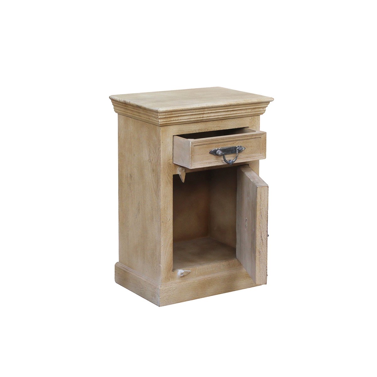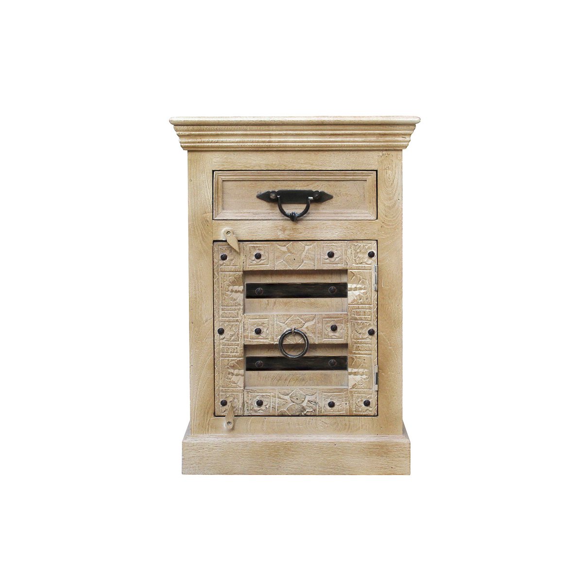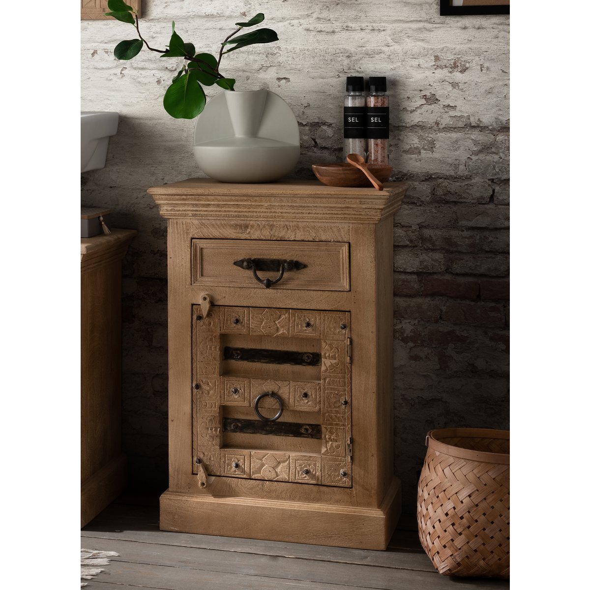 Deze kleine ladekast van licht mangohout met rijkelijk gesneden decoraties is een echte blikvanger. Achter het deurtje en in de lade biedt hij voldoende opbergruimte voor je persoonlijke spullen. De afdekplaat is ook geschikt voor accessoires of kamerplanten. De ladekast kan op vele manieren worden gebruikt, bijvoorbeeld als nachtkastje, in de badkamer of in elke andere kamer. Hij siert iedere kamer en brengt dankzij zijn koloniale uitstraling een vakantiegevoel in huis. Uitgebreide gravures.
