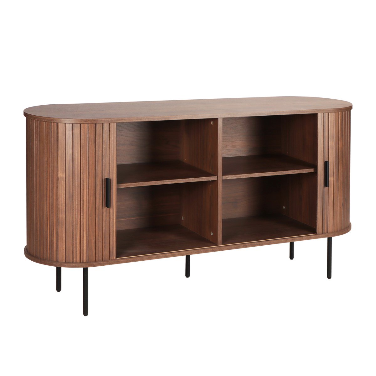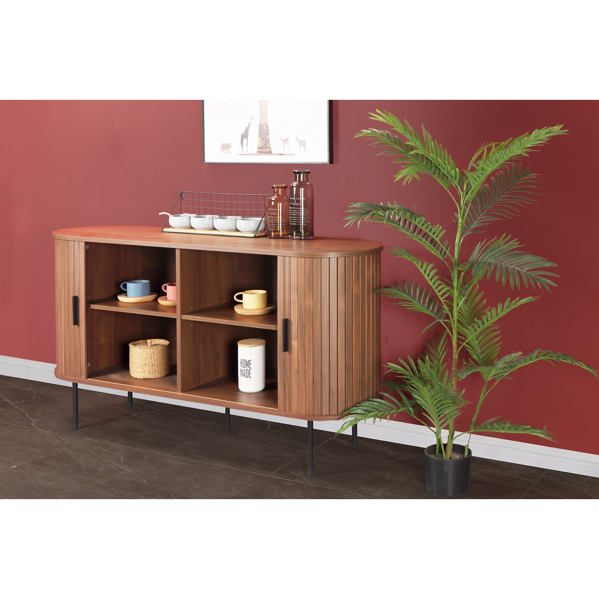 Dit dressoir combineert tijdloze esthetiek met praktische functionaliteit en zet stijlvolle accenten met zijn nobele walnootlook. Perfect voor moderne woonkamers straalt het een warme, gezellige sfeer uit en biedt tegelijkertijd een verscheidenheid aan opslagruimte. De robuuste melamineplaat in walnootverf geeft het dressoir een luxueuze noot. De stabiele, poedercoaten metalen benen en de eenvoudige zwarte handgrepen vullen het ontwerp aan met een modern contrast en zorgen voor duurzaamheid. Achter twee gladde schuifdeuren zijn er vier ruime compartimenten die ideale opslagruimte bieden voor boeken, gerechten of alledaagse voorwerpen. De elegante lamella -look van de deuren geeft het meubel een unieke look die perfect functionaliteit en ontwerp met elkaar verbindt. Het heldere, verminderde ontwerp van het dressoir volgt de principes van de Scandinavische inrichtingstijl. De warme walnootkleur harmoniseert met de eenvoudige vormen en creëert een uitnodigende sfeer die naadloos in verschillende levende concepten past. Dit dressoir in walnootkleur is meer dan een praktisch meubelstuk – het is een stijlvol statement. Met zijn nobele houten uitstraling, moderne latfronten en stabiele metalen benen, brengt het Scandinavisch minimalisme en elegantie aan uw huis. Of het nu in de levenden, dineren of studie- dit meubelstuk is een opvallende met veelzijdig gebruik. 4 compartimenten achter de deuren, voeten metaalpoeder -gecoat, handgreep kleur: zwart, handgreepmateriaal: aluminium, hoogte voeten: 20 cm, laadcapaciteit dekplaat: 30 kg, laadcapaciteit vloeren: 5 kg