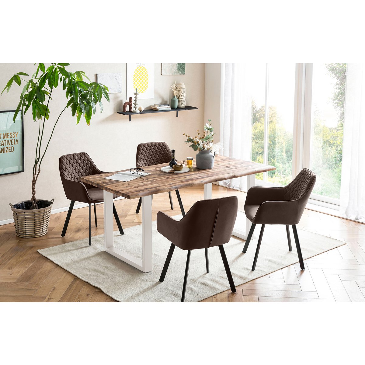 Massief houten meubelen gemaakt van acaciahout zijn een van de tijdloos mooie meubelstukken die nooit uit de mode raken. Deze 5-delige eetgroep maakt ook indruk met de eettafel met een 35 mm dik tafelblad van massief acaciahout. Het ruwe balkenoppervlak is een absolute blikvanger. Bijzonder hoogtepunt: het U-frame van wit gelakt metaal geeft de tafel een zeer goede stabiliteit en is de perfecte tegenhanger van het tafelblad in een warme natuurtint. Deze eettafel is meer dan alleen een plek om te eten. Haal een stukje natuur binnen in uw eigen vier muren. De stoelen zijn bekleed met een hoogwaardige stoffen bekleding in een matte fluwelen look. De fauteuilvormige zitschaal is aan de binnenkant voorzien van uitgebreide diamantquilts. De ergonomisch afgeronde hoeken en randen, de armleuningen en de aangename rugleuninghoogte zorgen voor zitcomfort van topklasse. Let op: Omdat deze massief houten tafel een natuurproduct is, kunnen er knoesten of afwijkende kleurdecoraties voorkomen, maar deze duiden niet op fouten, maar onderstrepen eerder het individuele karakter van het echte hout. Afmetingen van de tafel: B160xD90xH75 cm, afmetingen van de stoel: B61xD68xH82 cm, zithoogte ca. 46 cm, zitbreedte ca. 42 cm, max. belasting 120 KG, hoogte van de armleuningen ca cm, hoogte van de rugleuning ca. 33,5 cm, lichtweerstandshoes = 4, pillinghoes = 5, slijtvastheid = 60.000 schuurcycli, plaatdikte: 35 mm, afstand tussen de poten: ca. 103 cm.