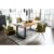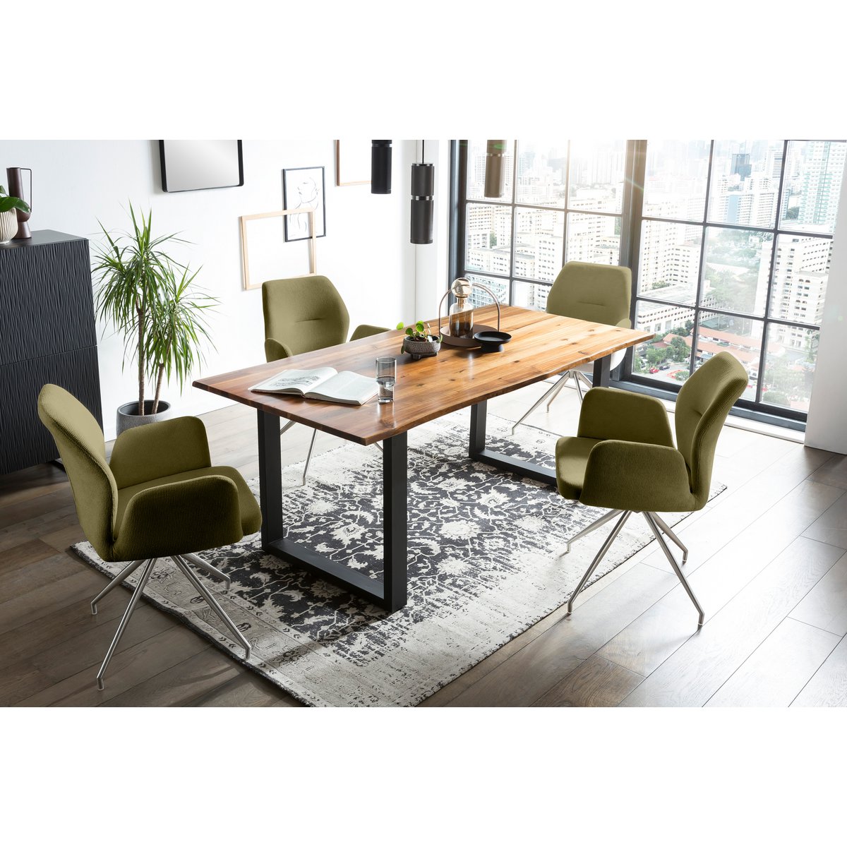 Deze 5-delige eetgroep, bestaande uit een eettafel van massief hout en 4 fauteuils met een tijdloze structuurstoffen bekleding, biedt de optimale plek voor gezellige bijeenkomsten. Het 26 mm dikke tafelblad is gemaakt van acaciahout en is gemaakt van echte boomrand. Het U-frame van zwart gelakt metaal geeft de tafel een zeer goede stabiliteit en is de perfecte tegenhanger van het prachtige cognackleurige tafelblad. Overtuigt door zijn moderne uitstraling en hoogwaardige afwerking: Met zijn moderne design past de fauteuil met 180° draaifunctie in uw huis. De gestoffeerde stoel maakt indruk door zijn trendy designtaal met een ergonomisch gevormde rugleuning met sierstiksels, een rechte zitting en licht uitlopende armleuningen. Het zitmeubilair is bekleed met een elegante structuurstof met duurzame eigenschappen en is verkrijgbaar in vele aantrekkelijke effen kleuren. Een ander hoogtepunt is het delicate designframe van roestvrij staal. Het geïntegreerde draaimechanisme zorgt ervoor dat de stoel dynamisch kan zitten. Let op: Omdat deze massief houten tafel een natuurproduct is, kunnen er knoesten of afwijkende kleurdecoraties voorkomen, maar deze duiden niet op fouten, maar onderstrepen eerder het individuele karakter van het echte hout. Afmetingen tafel: B180xD90xH77 cm, bladdikte 26 mm, met echte boomrand, afmeting stoel: B60xD62xH89 cm, zithoogte: 45 cm, zitbreedte: 46 cm, zitdiepte: 47 cm, hoogte armleuning: 68 cm, hoogte rugleuning: 49 cm, frame van roestvrij staal, ergonomisch gevormde rug- en armleuningen, materiaal bekleding: stoffen bekleding, 100% PES, bekleding rondom: met bekleding rondom, slijtvastheid: 50.000 schrobbeurten, pilling: 5 = geen pilling, licht weerstand: 4 = redelijk