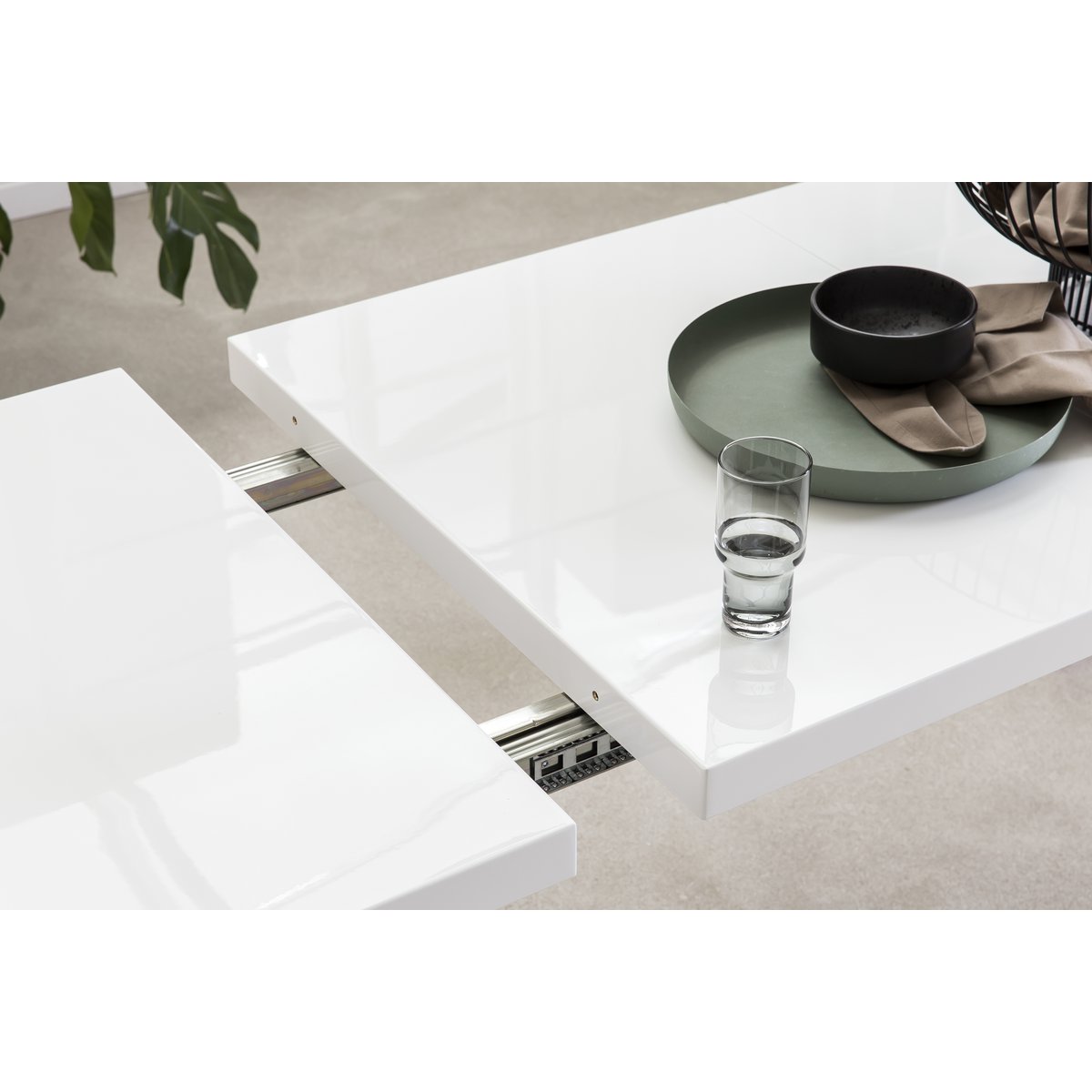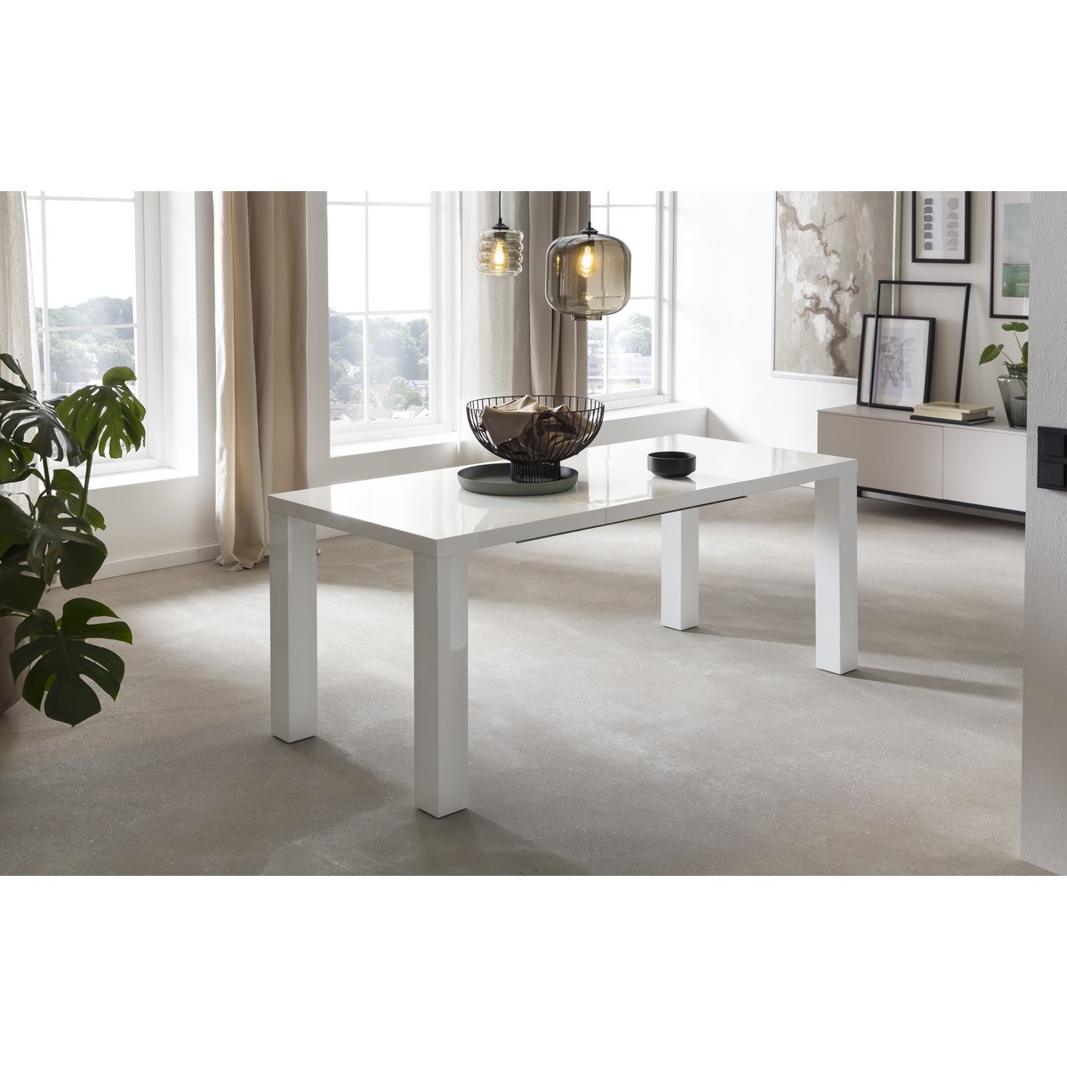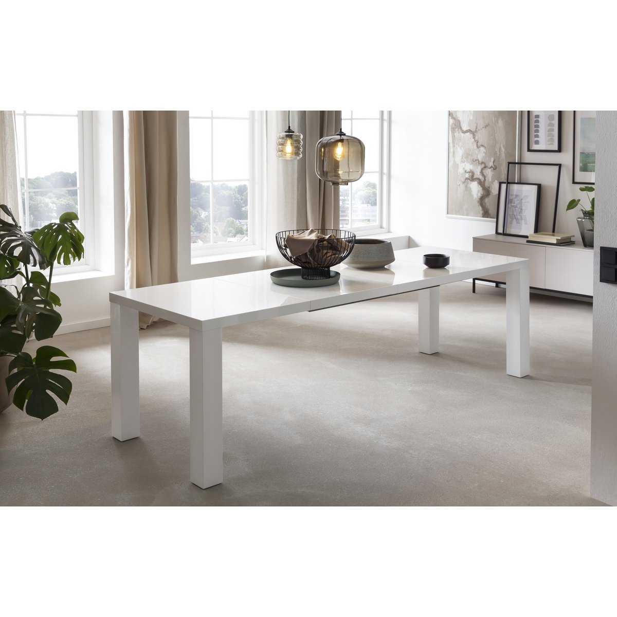 Iedereen die van puristisch vormgegeven meubels houdt, zal dol zijn op deze eettafel. Deze tafel zal de perfecte glans toevoegen aan elke eetkamer of keuken. De tafel is gemaakt van MDF-hout. De hoogglansafwerking in wit benadrukt de heldere vormentaal zeer goed. De vier vierkante poten zijn niet alleen extra breed, maar geven de tafel ook een zeer goede stabiliteit. En als er onverwacht bezoek komt, verleng je het tafelblad met de twee verlengplaten tot maximaal 240 cm. De eettafel biedt niet alleen een praktische zitplaats om te dineren, maar is ook een ontmoetingsplaats voor een spelletjesavond met vrienden en familie. Aantal personen: 6-8 personen, plaatdikte: 4,5cm, afmetingen volledig uitgeschoven: B 240 x D80 x H76cm, uitschuifbaar met 2 verlengplaten 60×80 cm.