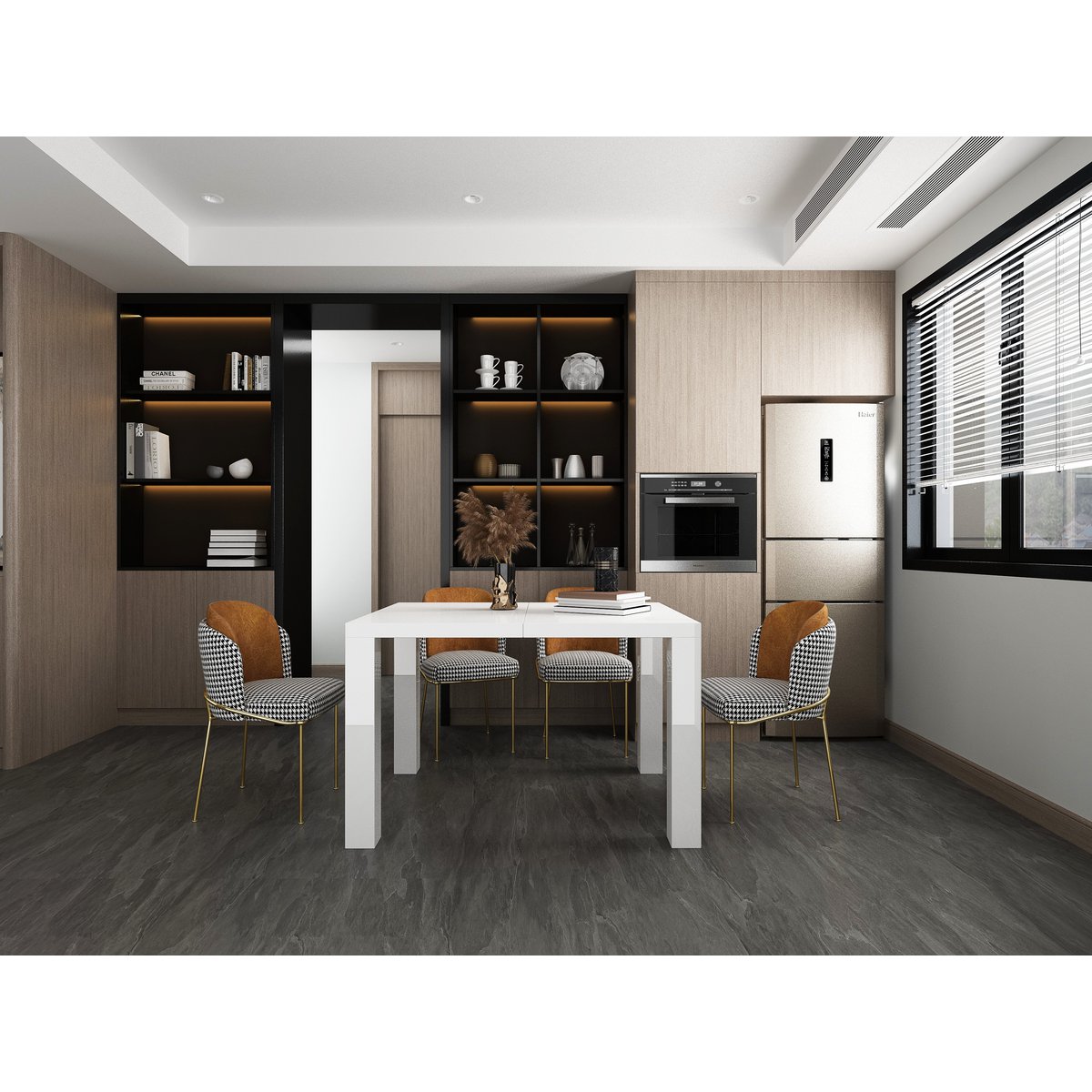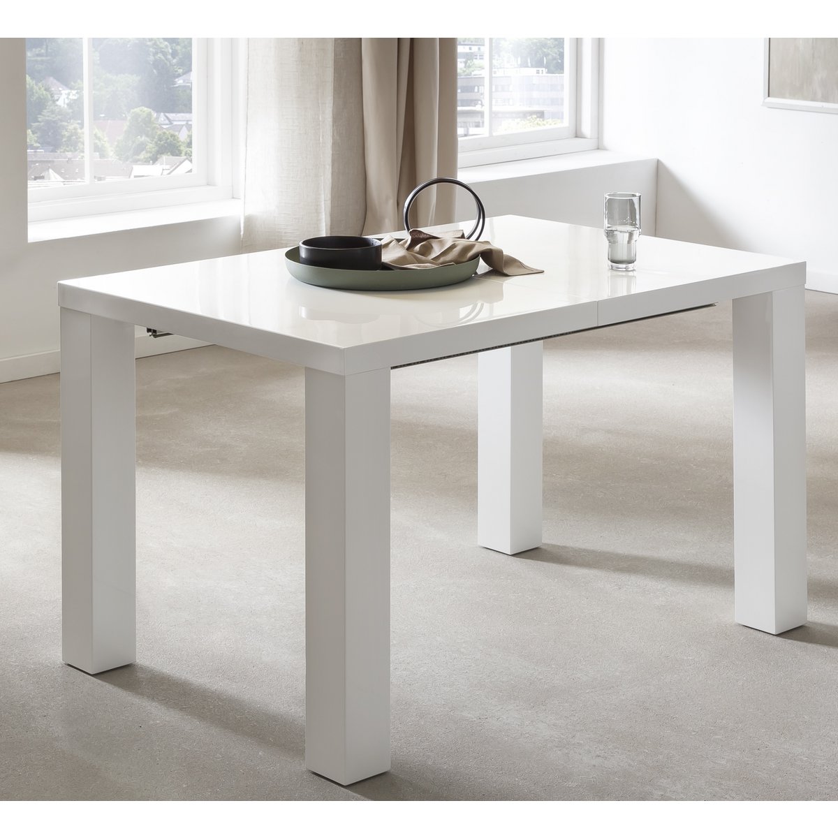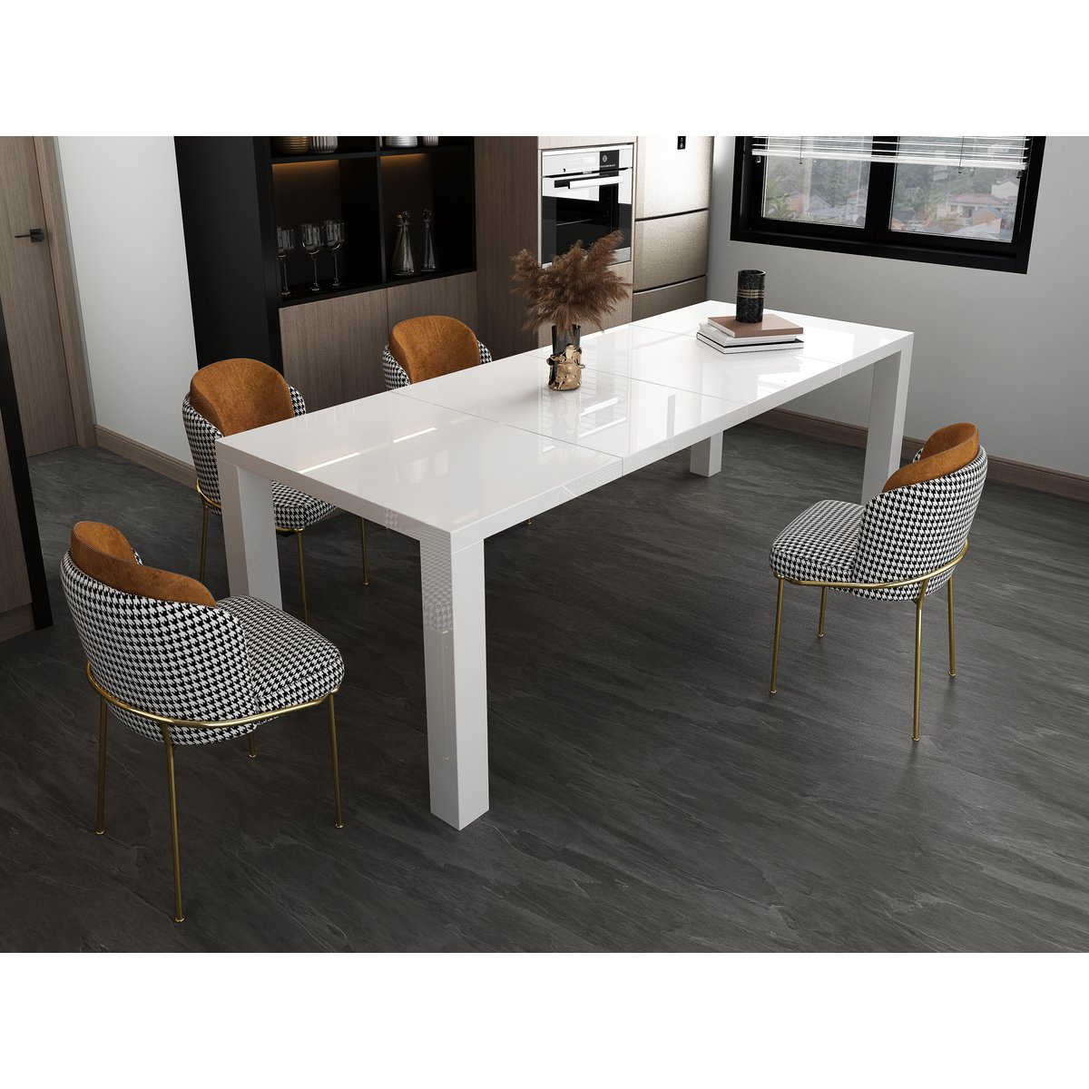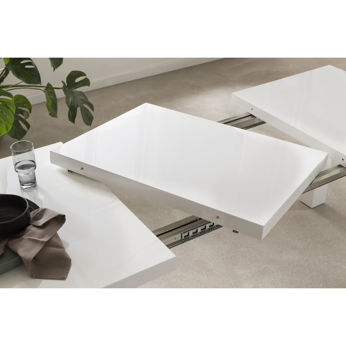 Iedereen die van puristisch vormgegeven meubels houdt, zal dol zijn op deze eettafel. Deze tafel zal de perfecte glans toevoegen aan elke eetkamer of keuken. De tafel is gemaakt van MDF-hout. De hoogglansafwerking in wit benadrukt de heldere vormentaal zeer goed. De vier vierkante poten zijn niet alleen extra breed, maar geven de tafel ook een zeer goede stabiliteit. En als er onverwacht bezoek komt, verleng je het tafelblad met de twee verlengplaten tot maximaal 240 cm. De eettafel biedt niet alleen een praktische zitplaats om te dineren, maar is ook een ontmoetingsplaats voor een spelletjesavond met vrienden en familie. Aantal personen: 6-8 personen, plaatdikte: 4,5cm, afmetingen volledig uitgeschoven: B 240 x D80 x H76cm, uitschuifbaar met 2 verlengplaten 60×80 cm.