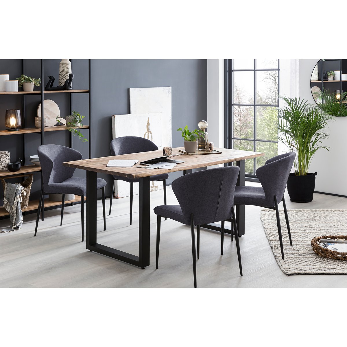 Massief houten meubelen gemaakt van acaciahout zijn een van de tijdloos mooie meubelstukken die nooit uit de mode raken. Het 26 mm dikke tafelblad is gemaakt van acaciahout en is gemaakt van echte boomrand. Het U-frame van zwart gelakt metaal geeft de tafel een zeer goede stabiliteit en is de perfecte tegenhanger van het prachtige tafelblad in de kleur walnoot. Deze eettafel is meer dan alleen een plek om te eten. Breng een stukje natuur binnen uw eigen vier muren. Omdat deze massief houten tafel een natuurproduct is, kunnen er knoesten of afwijkende kleurdecoraties voorkomen, maar dit zijn geen gebreken, maar onderstrepen eerder het individuele karakter van het echte hout. Ook de diepte kan door de onregelmatige en asymmetrische vorm enkele centimeters variëren. Al deze verschillen maken deze boomrandtafel werkelijk uniek. Tafelblad behandeld met Osmo hardwaxolie in walnootkleur met een satijnen afwerking, beschermt tegen water, vuil en slijtage, frame zwart geverfd, afmetingen van het frame: ca. 4×8 cm
