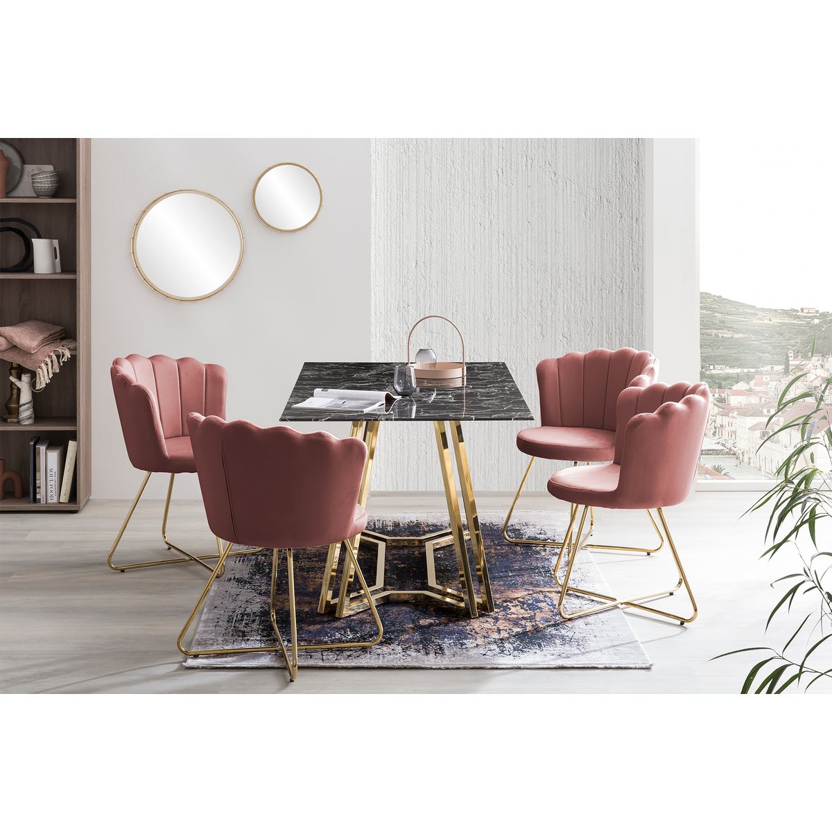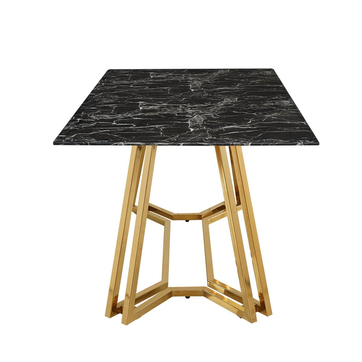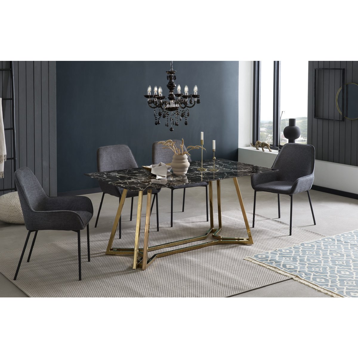 Het nieuwe pronkstuk in je eethoek is deze eettafel. Het zwarte marmerlook tafelblad is gemaakt van glas. Het goudkleurige frame ziet er niet alleen stijlvol uit, het geeft de tafel ook een zeer goede stabiliteit en past perfect bij het zwarte glazen blad. Meubels met een marmerlook zijn erg trendy en passen in vrijwel ieder interieur. Aan deze eettafel vindt meer plaats dan alleen de dagelijkse maaltijden. Hier kunt u uitgebreide gesprekken voeren met vrienden, familie of zakenpartners. Tafelblad 10 mm gehard glas (veiligheidsglas), verchroomd frame, max. draagvermogen: middengedeelte 120 kg, zijkanten 30 kg, hoogte onderkant tafel ca. 74 cm.