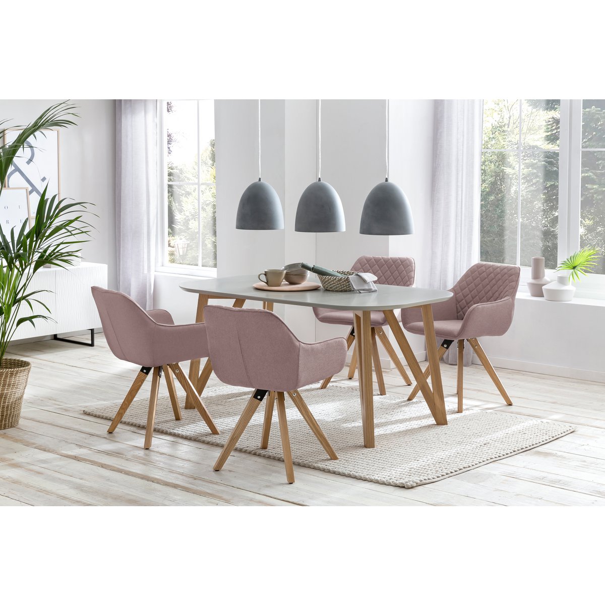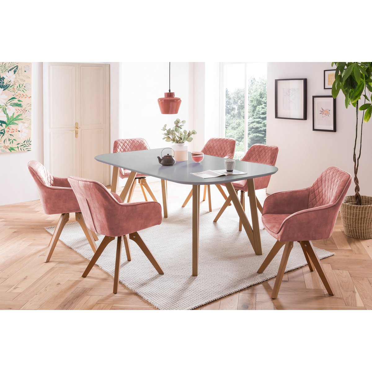 De moderne eettafel in Scandinavische stijl heeft een mat grijs geverfd tafelblad. Dit biedt voldoende ruimte voor familie en vrienden. Het schuine houten frame van massief eikenhout zorgt niet alleen voor een veilige stand, maar biedt ook een mooi contrast met het grijze ovale tafelblad. Dankzij het eenvoudige ontwerp past de eetkamertafel niet alleen bij een breed scala aan woonstijlen, maar is hij ook nog eens heel gemakkelijk in het onderhoud. Aantal personen: 6 personen, schuin houten frame van massief eikenhout, Scandinavisch design, afstand tussen de tafelpoten: ca. 164 cm.
