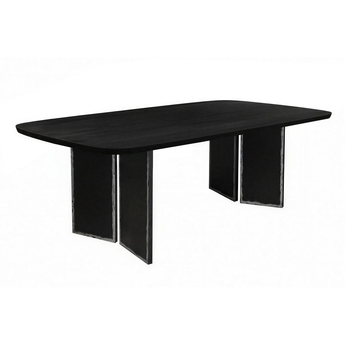 Deze tafel is een echt statement voor moderne woon- en werkruimtes. Met zijn 30 mm dik tafelblad (3 cm) van massief mangohout combineert hij natuurlijke substantie met een krachtige uitstraling. De afgeronde hoeken zorgen voor een harmonieuze vormentaal en geven het ontwerp ondanks zijn opvallende uitstraling een aangename zachtheid. Zowel het tafelblad als het frame zijn diepzwart gelakt, wat de tafel een bijzonder elegant en stedelijk effect geeft. De used look onderstreept het individuele karakter van het meubel en maakt elke uitvoering uniek met een eigen verhaal. Een bijzonder hoogtepunt is het buitengewone, tweedelige metalen zijframe. Het zorgt niet alleen voor maximale stabiliteit, maar zet ook een spannend architectonisch accent. De heldere lijnen van het frame vormen een mooi contrast met de levendige houtstructuur van het mangohouten blad. Of het nu als eettafel, vergadertafel of ruime werkplek is – deze tafel overtuigt door zijn robuuste afwerking, expressief design en een moderne, industriële esthetiek die op vele manieren gecombineerd kan worden. Een meubelstuk voor iedereen die op zoek is naar iets bijzonders en waarde hecht aan kwaliteit en karakter.