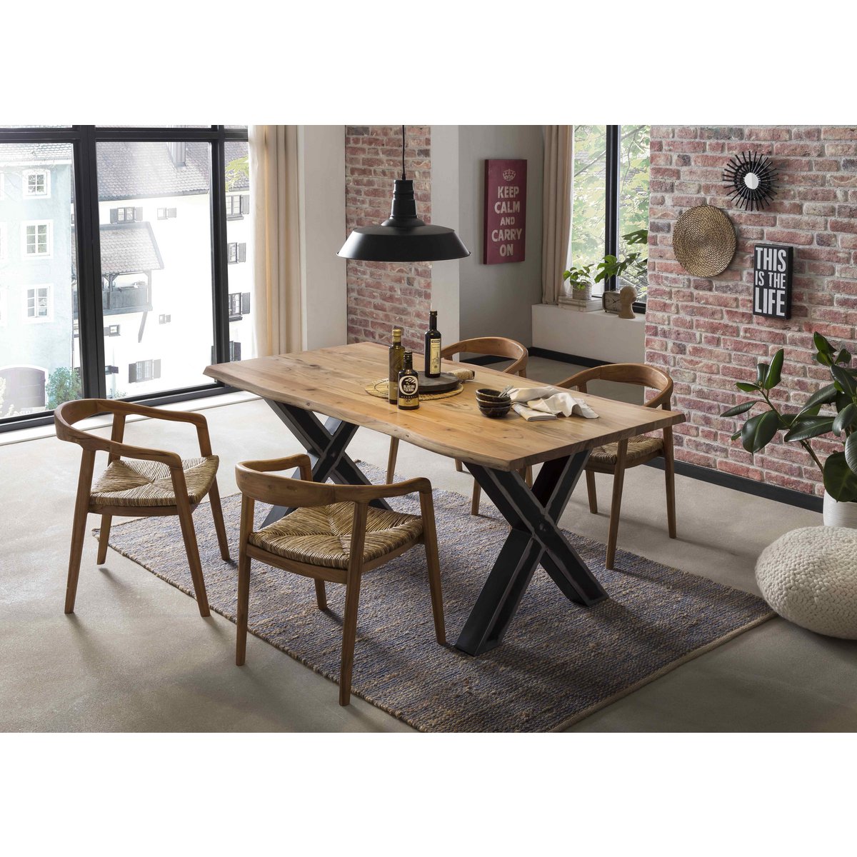 Het moderne X-vormige metalen frame vormt een krachtig contrast met het naturel houten blad en versterkt de industriële uitstraling van het ontwerp. Hierdoor ontstaat een mooie balans tussen warmte, comfort en een stoer karakter. Deze eettafel is ideaal als centrale plek voor dagelijkse maaltijden, gezellige diners en lange avonden met familie of vrienden. Omdat het tafelblad een natuurproduct is, kunnen knoestgaatjes en kleurafwijkingen voorkomen. Dit zijn natuurlijke kenmerken die de authenticiteit van het hout benadrukken.