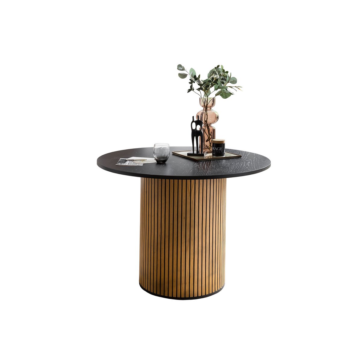 Scandinavische stijl geïnterpreteerd op een moderne manier! De eettafel biedt u eenvoudige Scandinavische elegantie. De combinatie tussen het kolomframe van MDF-hout met echt eikenfineer en het matzwart gelakte tafelblad zorgt voor een mooi contrast. Het geribbelde uiterlijk van de kolomvoet zorgt voor dat beetje extra. Ronde tafels zijn ook ideaal in kleine woon- en eetruimtes en bieden voldoende beenruimte en ruimte voor sociale bijeenkomsten. Ø van het onderstel: ca. 58 cm, tafelblad mat zwart gelakt.