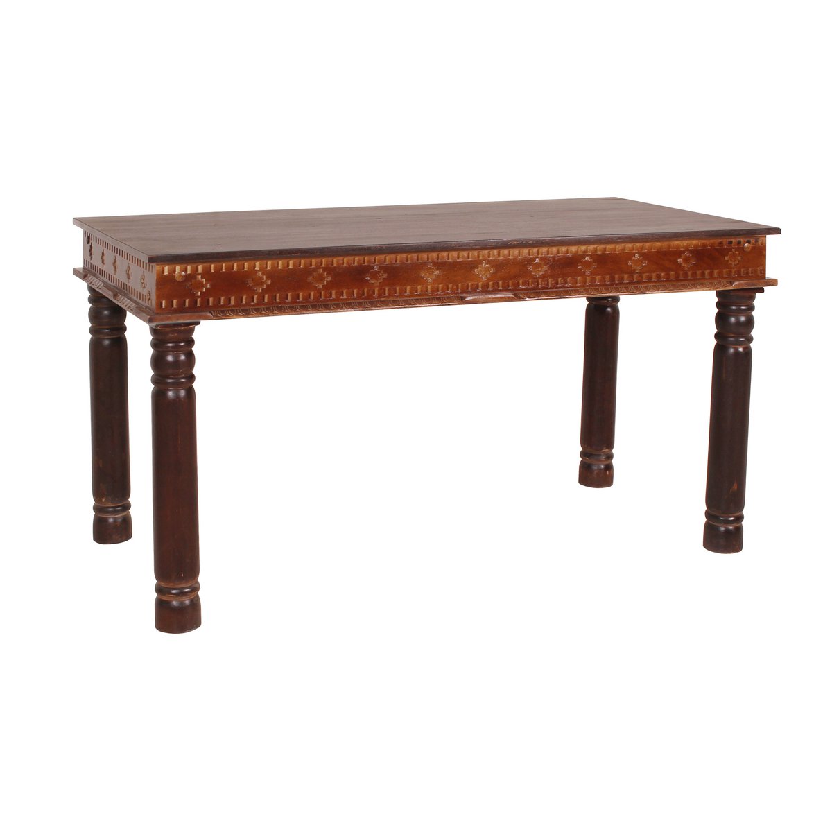 Deze eettafel van gerecycled hout combineert traditionele vormen met verfijnd houtsnijwerk en brengt daarmee direct sfeer en karakter in uw interieur. De rijke donkerbruine kleur van het oude hout geeft de tafel een warme en authentieke uitstraling die prachtig contrasteert met moderne witte meubels of lichtere houttinten. Daardoor ontstaat een stijlvol geheel waarin klassiek vakmanschap en eigentijdse inrichting mooi samenkomen.