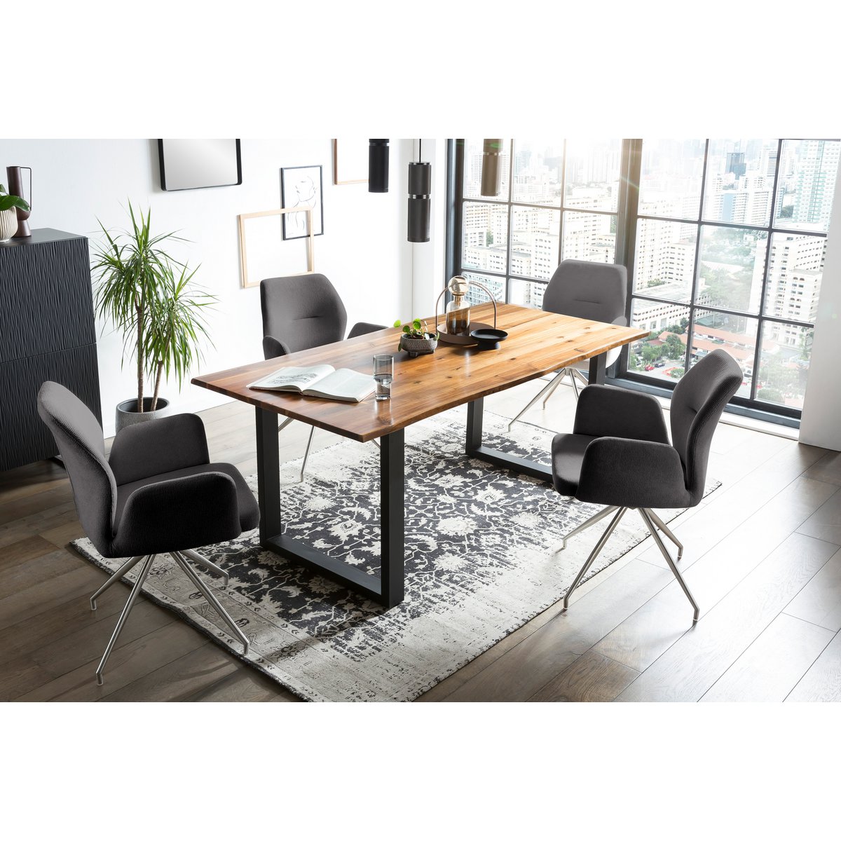De optimale Platz voor gesellige Runden bestaat uit 5-delige Essgruppe, bestehend van een Esstisch uit Massivholz en 4 Armlehnstühlen met zeitlosem Strukturstoff-Bezug. De 26 mm dikke Tischplatte besteht aus Akazienholz en wurde aus echter Baumkante gefertigt. De U-Gestell uit een zwart lakmetaal verleidt het gerecht tot een goede stabiliteit en is het passende gegenstück zur schönen Tischplatte in der Farbe Cognac. Bekijk de moderne optie en de hoge kwaliteit van de uitvoering: het moderne ontwerp past bij de armlehnstuhl met 180° draaifunctie in uw huis. De Polsterstuhl besticht door zijn trendy vormgeven met ergonomisch gevormde ruglehne met ziernaht, geaderde zitfläche en leicht ausgestellten armlehnen. Bezogen is de zitkamer met een van de strukturstoff, der zeer uitgebreide eigendomsrechten en in vele aantrekkelijke Unifarben zijn Auswahl-steht. Een ander hoogtepunt is het filigrane ontwerp dat uit roestvrij staal is vervaardigd. Door het geïntegreerde schakelmechanisme ermöglicht der sessie een dynamische sitzen. Tip: Als het om een massief holztisch product gaat dat in een natuurproduct wordt verhandeld, kan het zijn dat de astlöchern of de ongeïnteresseerde farbschmückungen komen, maar je kunt geen fehler-vragen stellen, als het individuele karakter van de echtholze niet wordt nagestreefd. Maße des Tischs: B160xT85xH77 cm, Plattenstärke 26 mm, met echter Baumkante, Maße des Stuhls: B60xT62xH89 cm, Sitzhöhe: 45 cm, Sitzbreite: 46 cm, Sitztiefe: 47 cm, Höhe der Armlehnen: 68 cm, Höhe der Rückenlehne: 49 cm , Gestell aus rostfreiem Edelstahl, ergonomisch geformte Rücken- und Armlehnen, Bezugsmateriaal: Stoffbezug, 100% PES, Rundumbezug: Mit Rundumbezug, Scheuerbeständigkeit: 50.000 Scheuertouren, Pillingbildung: 5 = keine Pillingbildung, Lichtbeständigkeit: 4 = ziemlich
