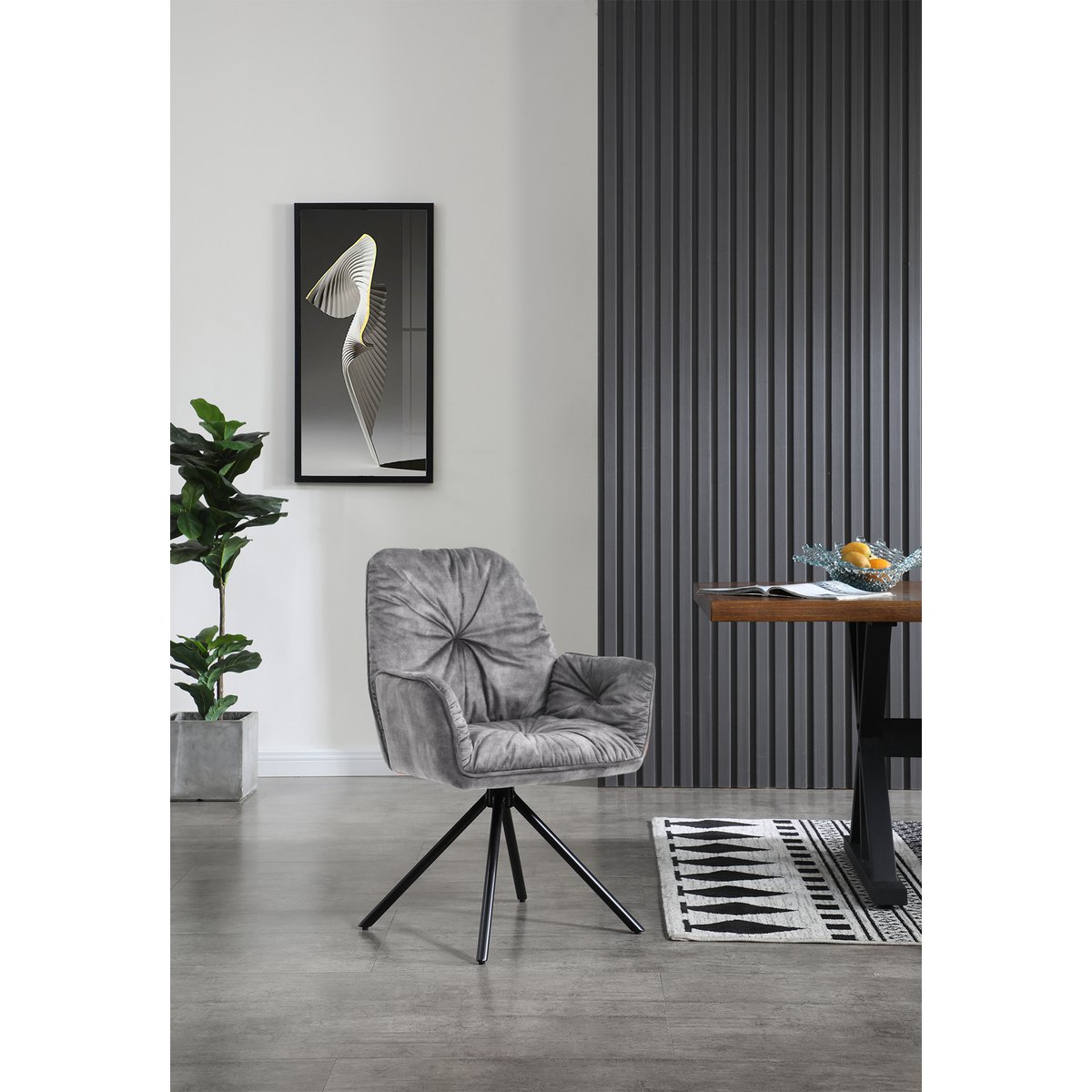 Deze fauteuil maakt indruk met zijn 360 graden draaifunctie. De grijze vintage fluwelen velours hoes ziet er vorstelijk uit en past perfect bij de zwarte poten. Het 4-poots metalen frame zorgt voor een veilige en stabiele stand. De gestoffeerde stoel biedt zitcomfort van topklasse dankzij de fauteuilachtige zitting. Een functioneel hoogtepunt is de 360 graden draaifunctie van de stoel. De knoopstiksels op de zitting, rugleuning en armleuningen zijn een lust voor het oog en maken dit meubel tot een absolute eyecatcher in je woonruimte. Dankzij het extravagante design kan deze gestoffeerde stoel ook als vergaderstoel worden gebruikt. Waar hij ook wordt gebruikt, u en uw gasten zullen dol zijn op deze luxe stoel. Met 360° draaibare plaat onder de zitting, zithoogte: ca. 50 cm, zitdiepte: ca. 43 cm, zitbreedte: ca. 45 cm. 48 cm, lichtsterkte hoes: 5, Pilling Cover: 5, Slijtvastheid: 15.000 schuurcycli.