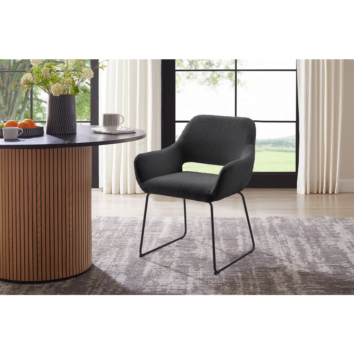 Met deze armleuningen met extravagante uitloopgaten is een moderne designcompagnon met een unieke uitstraling in de eigen vier muren. Der Bezug aus grob strukturiertem Bouclé Stoff trifft genau de Puls der Zeit en ist niet niet comfortabel, een van de punktet op een robuuste manier. De gepolsterde armen lopen door het zitcomfort van de stuhles, maar kunnen niet worden gebruikt. De zwarte Kufengestell uit matschwarz poederbeschichtetem Metall unterstreicht de moderne look zusätzlich. Als Esszimmerstuhl of als zitplaats in de buurt van de vloer of in de les – Dieser Armlehnstuhl met Bouclé Stoff heeft de garantie dat een goed figuur wordt gegarandeerd. Sitzhöhe: 52 cm, Sitztiefe: 45 cm, Sitzbreite: 44,5 cm, Höhe der Armlehnen: ca. 68 cm, Stahlgestell mat schwarz pulverbeschichtet, max. 120 kg, Bezug: 100% polyester, Lichtbeständigkeit Bezug: 4, Pilling Bezug: 5, Scheuertouren 100.000.
