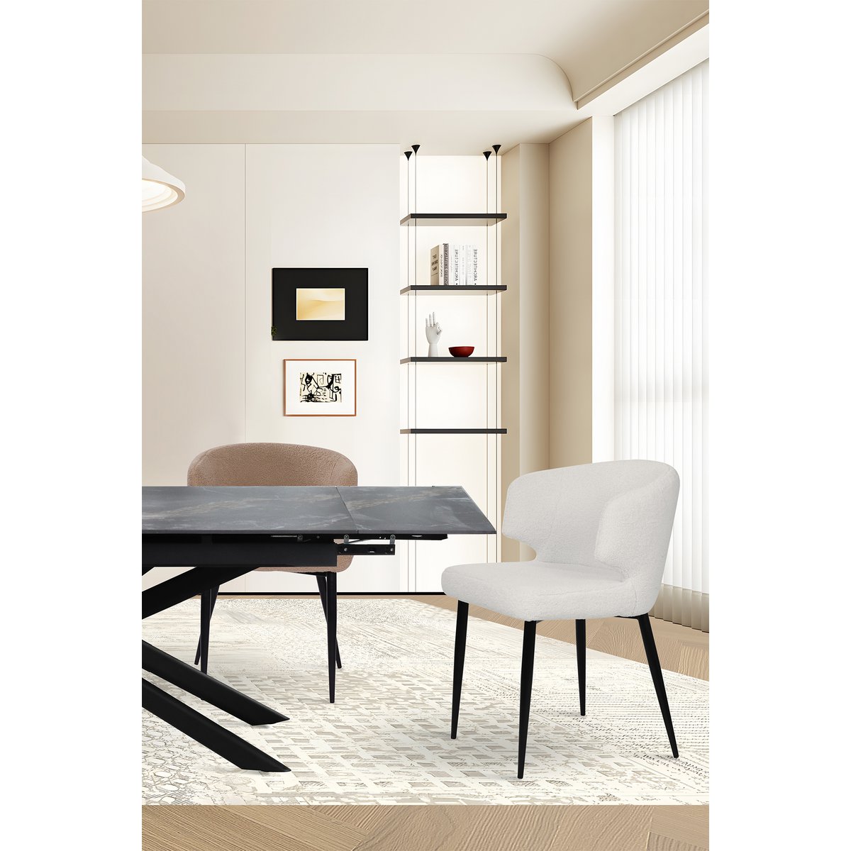 Voeg een vleugje gezelligheid en moderne chic toe aan je woon- of eetkamer met deze set van 2 fauteuils. De gezellige hoes van teddybont nodigt uit om te ontspannen en brengt een warm, zacht gevoel in huis. Tegelijkertijd is de stof Oeko-Tex-gecertificeerd, wat een milieuvriendelijke en verontreinigende productie garandeert. De strakke lijnen en het tijdloze design van deze stoelen maken ze tot een echte eyecatcher in elke omgeving. De stevige metalen poten zijn voorzien van een zwarte matte poedercoating, wat de set een moderne, elegante uitstraling geeft en tegelijkertijd duurzaamheid garandeert. Dankzij de zachte vulling en de ergonomische armleuningen bieden de stoelen een bijzonder hoog zitcomfort. Of het nu aan de eettafel, in de woonkamer of op kantoor is: deze stoelen combineren functionaliteit en stijl op het hoogste niveau. Of het nu gaat om een comfortabele zitplaats voor gezellige avonden of als stijlvolle aanvulling op het thuiskantoor, de fauteuilset van 2 met teddybontbekleding past zich flexibel aan uw woonstijl aan en past harmonieus in zowel moderne als klassieke interieurs. Zithoogte: ca. 53 cm, zitbreedte: ca. 53 cm, zitdiepte: ca. 45 cm, polyetherpolyolschuim, bekleding 100% polyester, poten met zwarte matte poedercoating, lichtbestendige hoes 4, pillinghoes 4, slijtvast weerstand 30.000 schuurcycli/Martindale, bekledingsmateriaal Oeko-Tex gecertificeerd