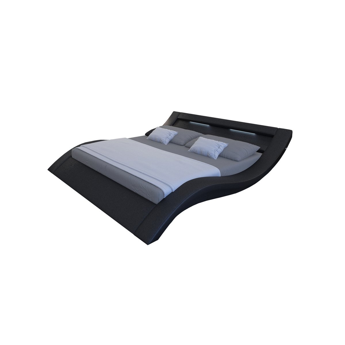 Het moderne gestoffeerde bed in zwart maakt indruk met zijn gebogen lijnen. De stijlvolle hoes is gemaakt van onderhoudsvriendelijk kunstleer. Het bed is uitgerust met een vrijdragende centrale steun. Profiteer van de mogelijkheid om twee kleine matrassen of één groot matras met verschillende hardheidsgraden te gebruiken. Dit is een enorm voordeel, vooral als koppel met verschillende slaapgewoonten. Bijzonder slim zijn de twee LED-lichtstrips die in het hoofdbord zijn verwerkt. Ze zorgen voor een aangenaam warme sfeer in je slaapkamer en zijn geschikt voor lange avonden tv kijken en lezen. Met dit designhoogtepunt kunt u een individuele stiltezone in uw slaapkamer creëren. zonder matras en lattenbodem, geïntegreerde lichtlijst (elk 2 LED-lampen 30 cm lang), framehoogte ca. 40 cm, hoogte van het hoofdbord ca. 69 cm, lattenbodem verlaagd ca. 19 cm, zelfdragende middenstijl hoogte ca. 40 cm.