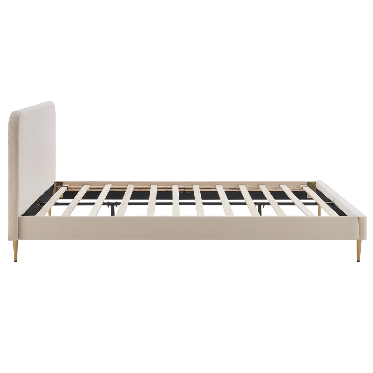 Dit gestoffeerde bed met hoogwaardige fluwelen bekleding brengt elegante charme in het slaapgedeelte. Het eenvoudige design en de eenvoudige lijnen maken het bed tot de ideale aanvulling op vele woonomgevingen en inrichtingsstijlen. De goudkleurige chromen poten creëren een modern karakter in contrast met het zachte fluweel van het frame. Een eenvoudige lattenbodem is al bij de levering inbegrepen. De bodemvrijheid van 15 cm onder het bed kan indien nodig optimaal worden benut als opbergruimte; er is ruimte voor bijvoorbeeld platte dozen met beddengoed of seizoenskleding. Met de drie beschikbare kleur- en maatvarianten vindt iedereen zeker zijn favoriet die bij zijn behoeften past. Breedte van het hoofdbord: ca. 151,5 cm, hoogte van het hoofdbord ca. 91 cm, hoogte van de poten: ca. 15 cm, hoogte van vloer tot bovenkant bedframe: ca. 29,5 cm 4 cm, inclusief eenvoudige lattenbodem, poten van goudgeverfd staal, instaphoogte 30 cm, afstand vloer tot zijdeel 15 cm, met middenstang.