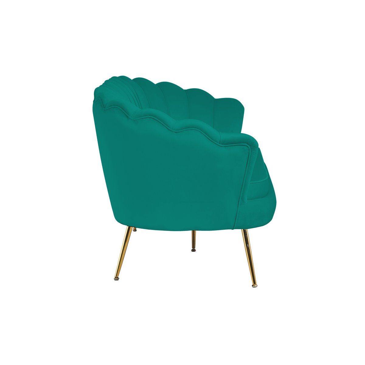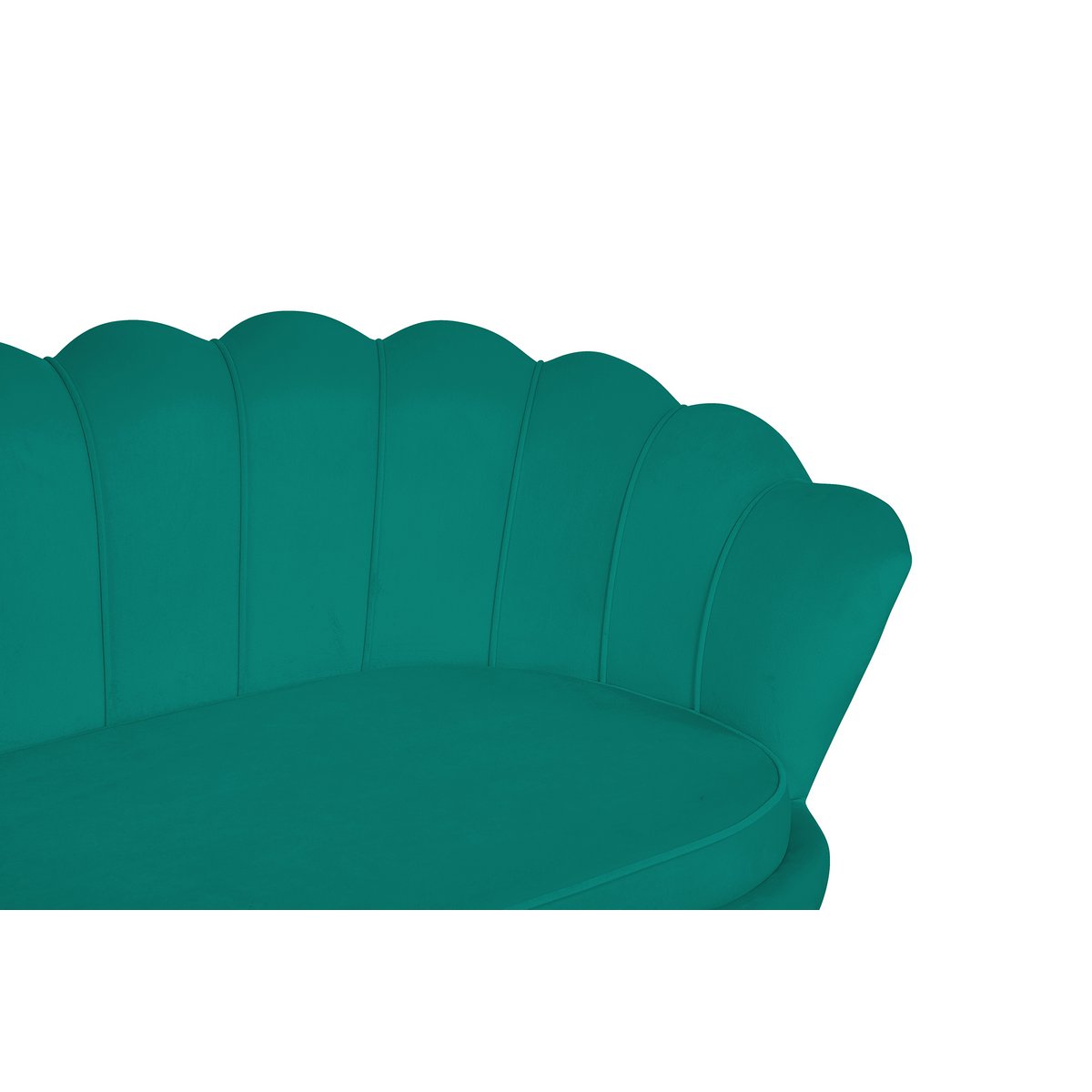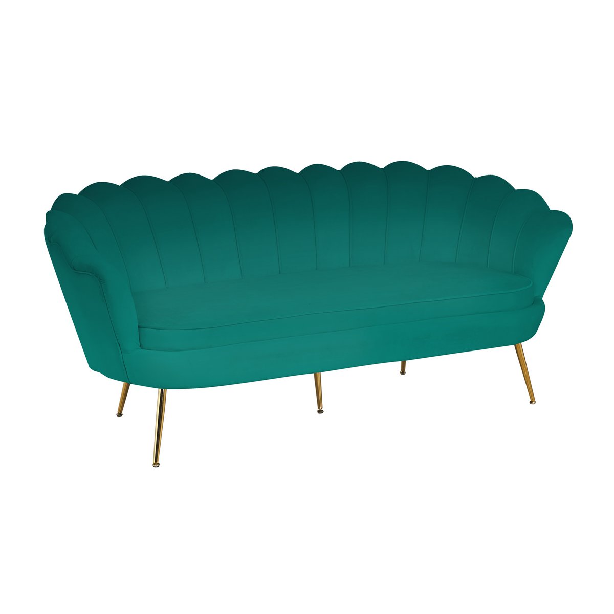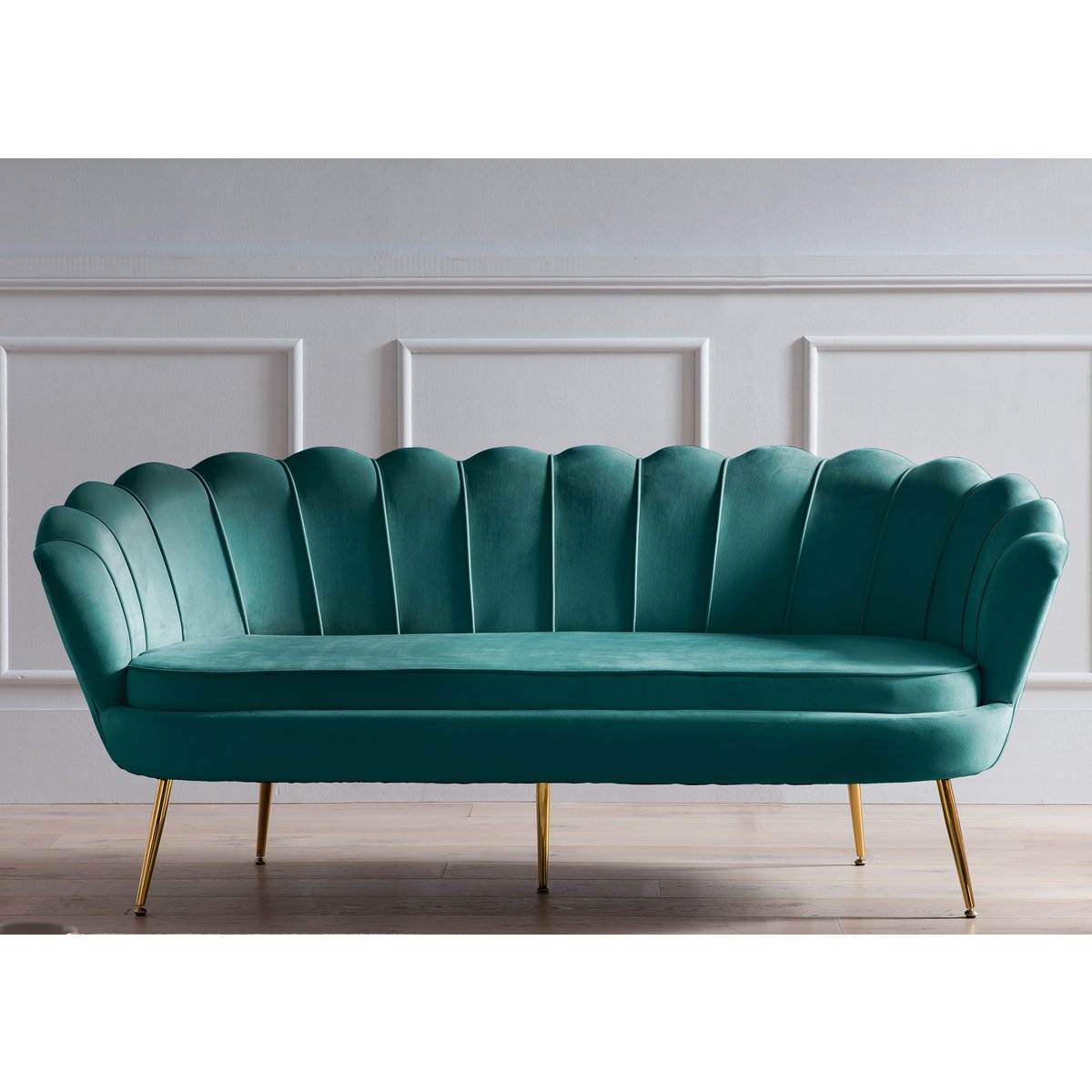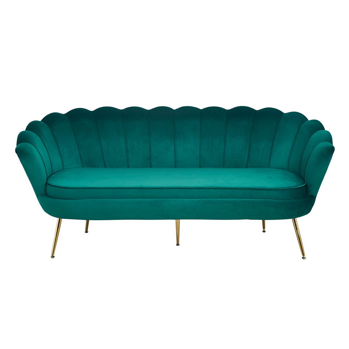 Deze moderne 3-zitsbank in schaaldesign combineert luxe uitstraling met hoog zitcomfort. De groene bekleding in fluwellook geeft de bank een elegante en warme uitstraling, terwijl het goudkleurige metalen onderstel zorgt voor een chic contrast. De afgeronde zit- en rugdelen versterken het zachte, uitnodigende karakter van het ontwerp.