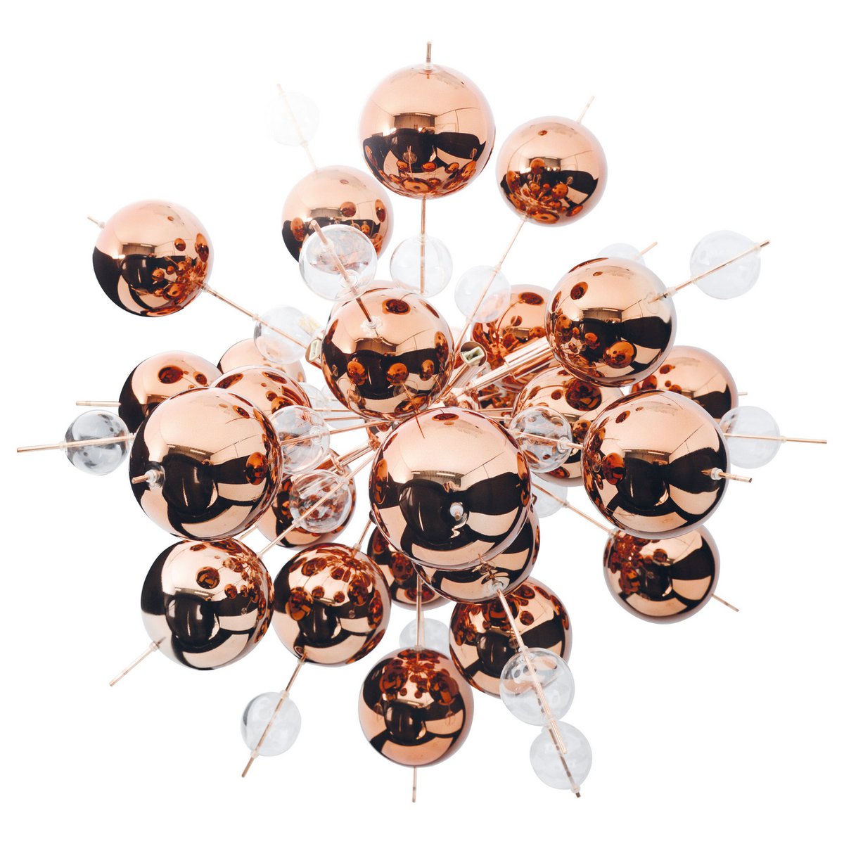 De hanglamp “explosie” ziet eruit als een momentopname van een “explosie”. De glanzende koper -gekleurde en transparante glazen ballen zijn bevestigd aan een chroom -gekleurde, glanzende middelgrote bal met metalen staven.