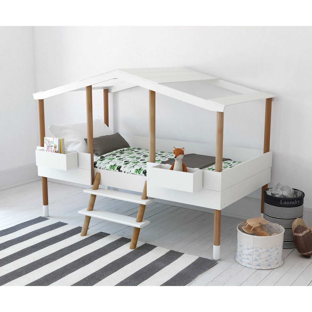 Dit bed bewijst dat het bij de inrichting van de kinderkamer ongebruikelijk kan zijn. De huisvormige basis met veel open ruimte biedt voldoende ruimte om te spelen en te slapen en er zijn zelfs bloembakken die als opbergruimte gebruikt kunnen worden. Door stoffen of gordijnen aan de houten spijlen te bevestigen, is het bed in een mum van tijd te personaliseren. De omringende valbeveiliging zorgt voor extra veiligheid voor de slaap van uw kind. Onder het bed is opbergruimte voor speelgoed, voor meer organisatie zijn er twee extra lades (art.nr. 12020055) beschikbaar. De lattenbodem voor een matrasmaat van 90×200 cm is bij de levering inbegrepen. Laat de fantasie van je kind de vrije loop en verander het bedje van een veilige slaapplek in een plek voor spel en avontuur. Het bed is gemaakt van robuust MDF-hout met een grenen frame. Met zijn Scandinavische, eenvoudige elegantie biedt het een moderne unisex-oplossing voor een breed scala aan kinderkamerinrichtingen en leeftijden. Of het nu als speelhuisje of als gezellig hoekje is, dit meubelstuk wordt zeker de nieuwe favoriete plek van je kleintje.